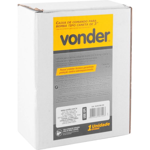 Caixa de Comando para Bomba Caneta 3 2,00hp 220V - VonderA caixa de comando Vonder é a solução ideal para o controle eficiente de bombas submersas. Projetada para facilitar o uso e aumentar a segurança do seu sistema de bombeamento, esta caixa de comando é indicada para a bomba código 66.86.200.220. Com a qualidade reconhecida da marca Vonder, você garante um produto durável e confiável para suas necessidades.**ESPECIFICAÇÕES TÉCNICAS:**- Voltagem: 220V- Marca: Vonder- Modelo: 6699200220- Material: Plástico- Código Universal de Produto: 7893946581503**FUNÇÕES E CARACTERÍSTICAS:**- Liga e desliga a bomba submersa**COMPATIBILIDADE:**- Indicada para bomba código 66.86.200.220**BENEFÍCIOS DO PRODUTO:**A caixa de comando Vonder proporciona um controle prático e seguro da sua bomba submersa, aumentando a eficiência do sistema e garantindo maior durabilidade do equipamento. Com um design robusto, ela é ideal para aplicações que exigem confiabilidade e segurança.**INSTRUÇÕES DE USO:**1. Conecte a caixa de comando à bomba submersa seguindo as instruções do manual.2. Verifique a voltagem correta antes de ligar o equipamento.3. Realize testes de funcionamento para garantir a instalação correta.**ITENS INCLUSOS:**- 1 Caixa de comando
