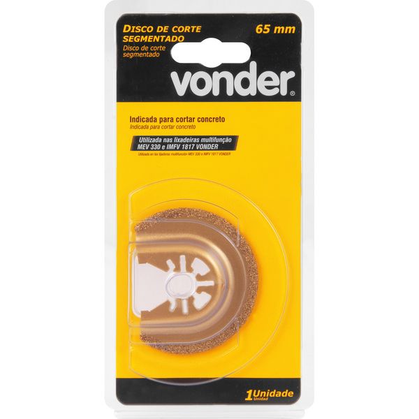 Marca:VonderConteúdo da Embalagem:1 Disco de corte para multifunçãoDescrição:Disco de corte segmentado para concreto, 65 mm, para Lixadeira Multifunção MEV 330, VONDERIndicações:Indicado para cortar concreto. Utilizado nas lixadeiras multifunção: MEV 330 VONDER, MED 330 DWT, IMFV 1817 VONDER e IMFD 1817 DWT.Características Técnicas:Categoria do multímetro: CAT III 600V Material do disco: Aço cromo vanádioCodigo do Forncedor:9316130500