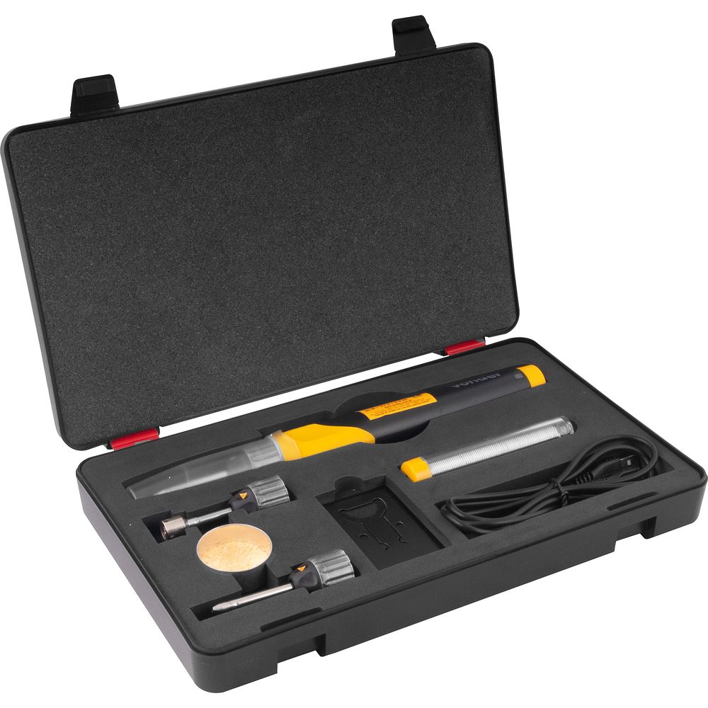 Ref. Fornecedor: 7465030000Marca: VonderConteúdo Embalagem:1 Ferro de solda. Acompanha: 1 ponteira cônica para solda, 1 ponteira chata para solda, 1 ponteira para aquecimento de termo retrátil, 1 rolo de estanho, 1 espuma para limpeza, 1 suporte, 1 cabo USB e 1 capa de proteção.Destaques e diferenciais:Possui bateria de lítio recarregável por uma fonte USB 5 V DC. Aquece em apenas 10 segundos. Como sua alimentação é bateria, proporciona maior liberdade e praticidade na operação, podendo realizar soldas ou aquecimentos em locais de difícil acesso ou até mesmo sem a necessidade de retirar a peça ou equipamento do local que está instalado.Aplicações e dicas de uso:Indicado para trabalhos de solda com estanho, aquecimento, dentre outras aplicações. Tempo de recarga: 4 horas. Autonomia da bateria: aproximadamente 40 minutos.Características Técnicas:Potência (W): 30 W Temperatura máxima: 600°C Bateria: 3,7 V - Íons de lítio Tensão do carregador de bateria: 5 V DC (cabo USB) Tempo de aquecimento: 10 segundos