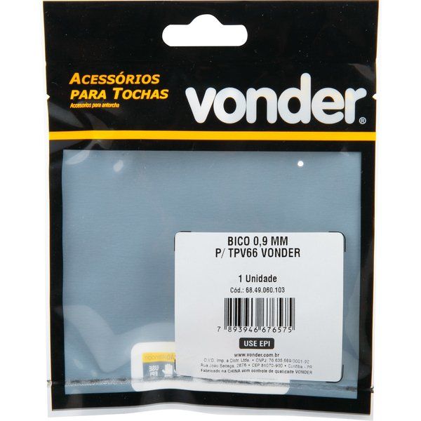 Bico Para Tocha TPV 66 VonderO bico para Tocha TPV 66 da Vonder é a escolha ideal para quem busca qualidade e eficiência em suas operações de soldagem. Fabricado pela renomada marca Vonder, este bico é projetado para garantir uma reposição perfeita, assegurando que sua tocha TPV 66 continue operando com máxima performance. A Vonder é conhecida por sua excelência em produtos para soldagem, oferecendo durabilidade e resistência em cada peça.Este bico é indicado especificamente para a Tocha TPV 66, mas se você possui outros modelos ou marcas, verifique a compatibilidade antes da compra. A instalação é simples e rápida, permitindo que você retome suas atividades sem complicações. Além disso, o bico é projetado para suportar altas temperaturas, garantindo segurança e eficiência durante o uso.**ESPECIFICAÇÕES TÉCNICAS**- Marca: Vonder- Código universal de produto: 7893946676575- Modelo: 6849060103**FUNÇÕES E CARACTERÍSTICAS**- Reposição ideal para Tocha TPV 66- Alta resistência ao calor- Fácil instalação- Durabilidade comprovada**INSTRUÇÕES DE USO**1. Certifique-se de que a tocha esteja desligada e fria antes de iniciar a instalação.2. Remova o bico antigo da tocha TPV 66.3. Encaixe o novo bico Vonder, garantindo que esteja bem fixado.4. Teste a tocha em um ambiente seguro para verificar a instalação correta.5. Realize manutenções periódicas para prolongar a vida útil do bico.**ITENS INCLUSOS**- 1 Bico para Tocha TPV 66 Vonder