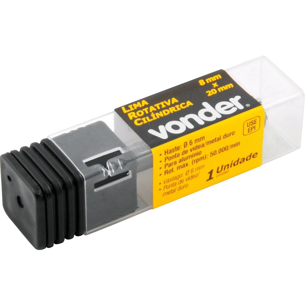 Marca: VonderConteúdo da Embalagem:1 Lima rotativaDestaques e diferenciais:Ponta de vídea/metal duro, proporciona maior vida útil, com geometria e ranhura apropriada para desbastes em peças de alumínio, com alto poder de remoção proporcionando agilidade e melhor acabamento no produto.Aplicações e dicas de uso:Utilizada em retificadeira para desbaste e acabamento em alumínioCaracterísticas Técnicas:Forma da lima rotativa: Cilíndrica Diâmetro da lima rotativa: 8,0 mm Comprimento total da lima rotativa: 60,0 mm Diâmetro da haste da lima rotativa: 6,0 mm