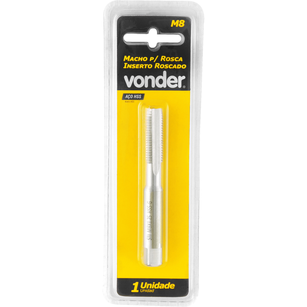Marca: VonderConteúdo da Embalagem:1 Macho para inserto roscado M8Destaques e diferenciais:Fabricado em aço HSSAplicações e dicas de uso:Utilizado para refazer roscas em metal, para aplicação do inserto M8Características Técnicas:Medida da rosca do macho (mm): 9,7 mm Material do macho: AÇO RÁPIDO 4241 HSS Tipo da rosca do macho: MA / MG - Milímetro rosca grossa Tipo do canal do macho: Canal reto
