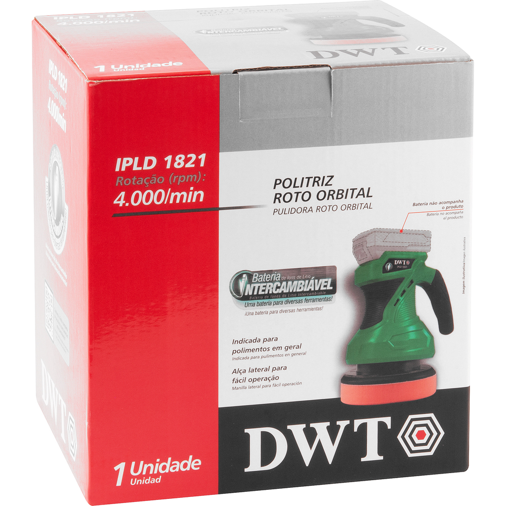 Marca: DWTConteúdo da Embalagem:1 Politriz. Acompanha: 1 disco de esponja (155 mm), 1 disco de lã (155 mm) e 1 disco de tecido (155 mm)Destaques e diferenciais:Este equipamento utiliza um modelo de bateria que pode ser intercambiável (não acompanha), ou seja, uma bateria que é compatível com outros modelos de ferramentas a bateria DWT. Por isso, em sua próxima compra de ferramenta a bateria DWT, procure um modelo que comece com a referência ?I?, ou que esteja identificado com o selo ?Bateria Intercambiável DWT?. Desta forma, você garante modelos mais econômicos, sem a necessidade de aquisição de novas baterias e carregadores para uso em seu equipamento. Possui base com sistema fixa fácil e cabo com revestimento emborrachado, proporcionando maior conforto ao operador. Aplicações e dicas de uso:Indicada para polimentos em geral. Baterias indicadas: 60.14.180.200 (2,0 Ah) e 60.14.180.400 (4,0 Ah). Carregadores indicados: 60.14.180.600 (carregamento rápido) e 60.14.180.500 (carregamento convencional).Características Técnicas:Diâmetro da base: 150 mm Diâmetro da esponja: 165 mm Rotação da politriz (rpm): 4.000/min Excentricidade: 5 mm Bateria: Não acompanha Tensão do carregador de bateria: Não acompanha