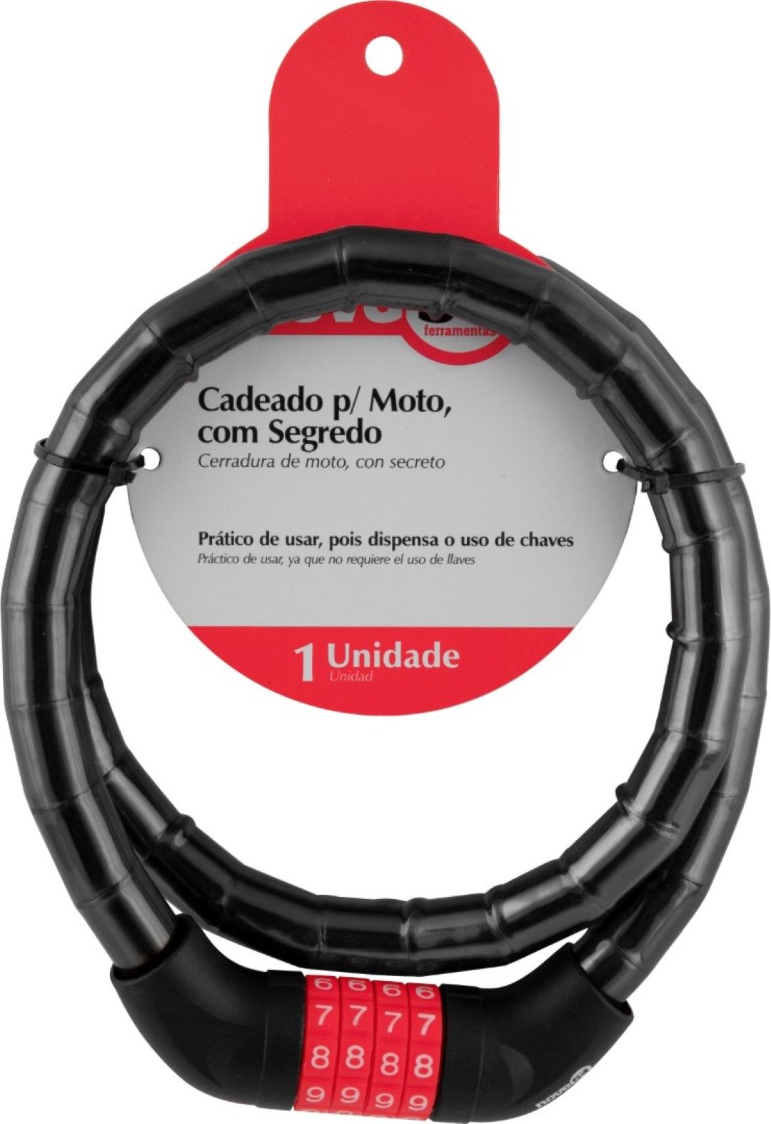 Marca: Nove54Conteúdo da embalagem: 1 Cadeado com segredoDestaques e diferenciais:Prático de usar, pois dispensa o uso de chaves.Dicas de uso:Indicado para trancar ou prender motos. Segredo com 4 algarismos. O segredo original são os números 0 0 0 0, que devem ser alterados para a numeração de preferência do usuário. A combinação de números (segredo escolhido) deverá ser anotada em local seguro, pois em caso de esquecimento não será mais possível abrir o cadeado.Detalhes Técnicos:Tipo de trava: Com segredo Comprimento: 100 cm
