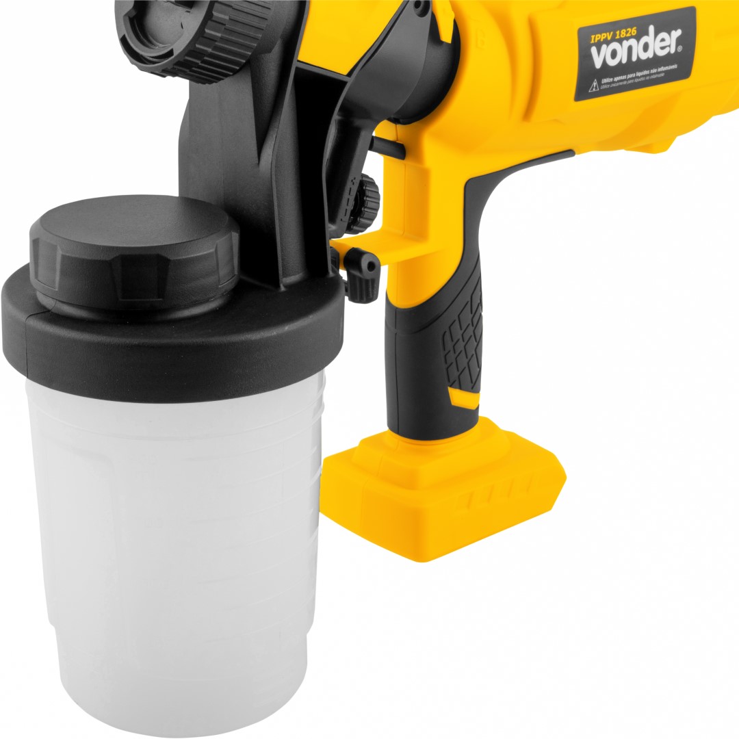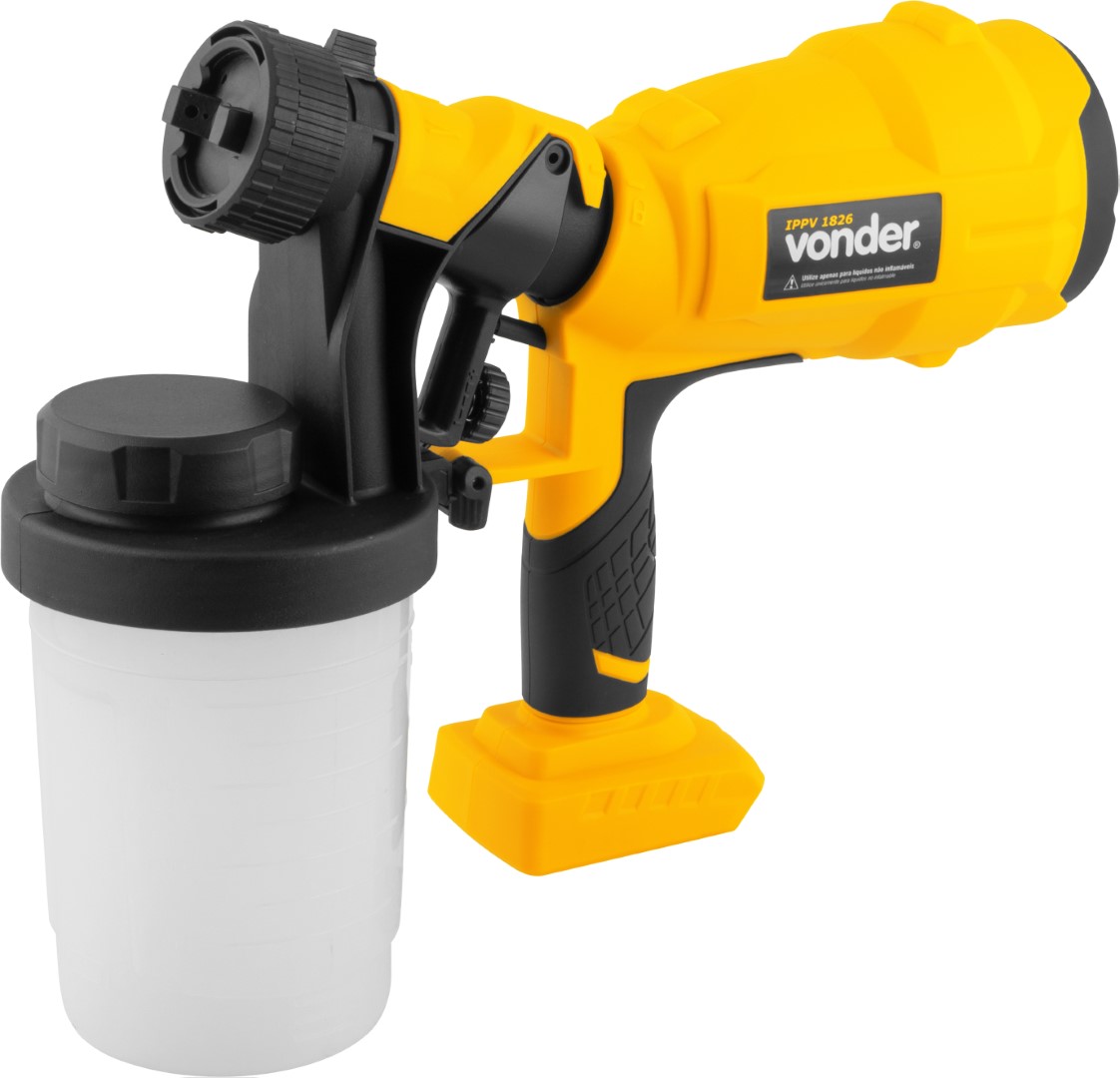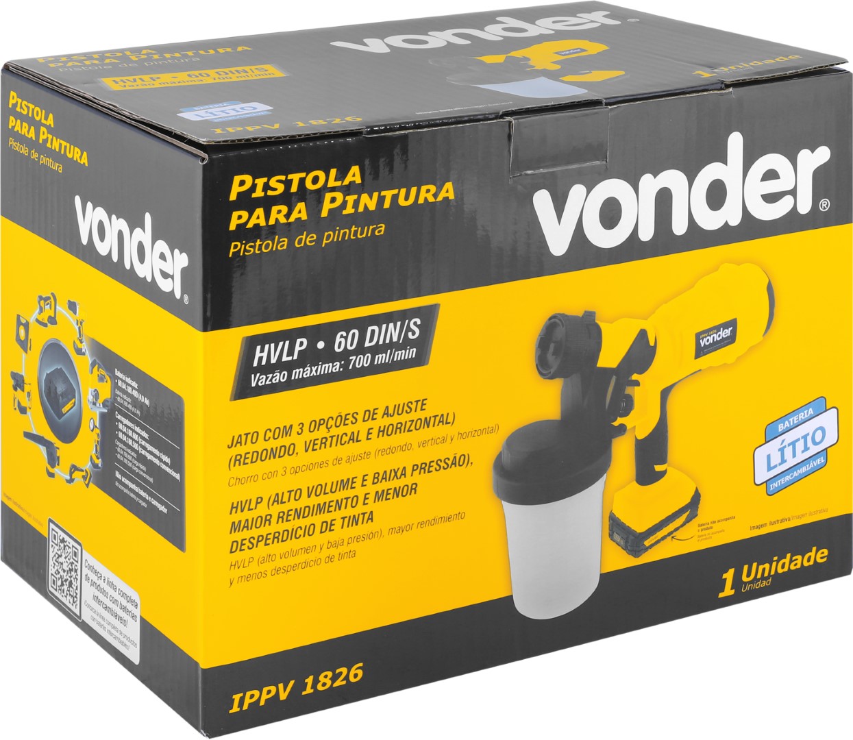 Marca: VonderConteúdo da embalagem: 1 Pistola para pintura. Acompanha: 1 medidor de viscosidade, 1 agulha, 1 escova e 1 sacador de agulha.Destaques e diferenciais:Este equipamento utiliza um modelo de bateria que pode ser intercambiável (não acompanha), ou seja, uma bateria que é compatível com outros modelos de ferramentas a bateria VONDER. Por isso, em sua próxima compra de ferramenta a bateria VONDER, procure um modelo que comece com a referência “I”, ou que esteja identificado com o selo “Bateria Intercambiável VONDER”. Desta forma, você garante modelos mais econômicos, sem a necessidade de aquisição de novas baterias e carregadores para uso em seu equipamento. Além de mobilidade e praticidade, pois dispensa o uso de compressores, reguladores, mangueiras extensas, entre outros acessórios ou equipamentos complementares. Possui jato com 3 opções de ajuste (redondo, vertical e horizontal), chave de ajuste do volume de tinta e sistema HVLP (alto volume e baixa pressão), proporcionando maior rendimento e menor desperdício de tinta.Dicas de uso:Indicada para aplicações de tintas sem pigmentos metálicos, como: tintas automotivas, látex, vernizes e esmalte à base sintética e à base de água, tanto profissionais quanto domésticas. Ideal para pintura de portas, portões, janelas, cadeiras, banquetas, brinquedos, artesanatos, entre outros. Aceita líquidos com viscosidade inferior a 60 DIN/S. Bateria indicada: 60.04.180.400 (4,0 Ah). Carregadores indicados: 60.04.180.600 (carregamento rápido) e 60.04.180.500 (carregamento convencional).Detalhes Técnicos:Bateria: Não acompanha Capacidade da caneca: 900 ml Diâmetro do bico: 2,5 mm Material da caneca da pistola: Plástico Tensão do carregador de bateria: Não acompanha Tipo da pistola: HVLP (alto volume e baixa pressão) Vazão máxima: 700 ml/min