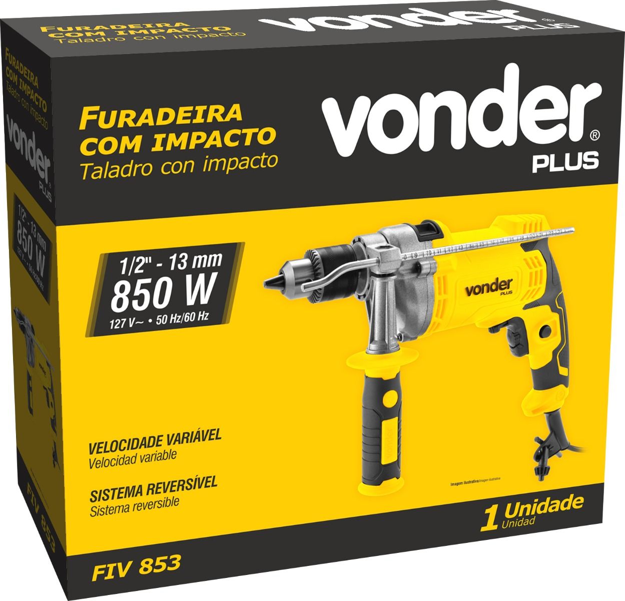 Marca: VonderConteúdo da embalagem:1 Furadeira com impacto. Acompanha: 1 chave para mandril, 1 limitador de profundidade e 1 punho auxiliar.Destaques e diferenciais:Possui interruptor eletrônico com pré-seleção de velocidade, o qual permite controlar a rotação da máquina, possibilitando iniciar um furo com uma rotação baixa e aumentar gradativamente de acordo com a necessidade de perfuração. Conta também com sistema reversível, que facilita a retirada da broca caso ela trave durante a perfuração. Possui botão trava do interruptor para trabalhos contínuos, punho auxiliar e limitador de profundidade, conferindo maior praticidade ao operador, além de motor com dupla isolação, que garante maior segurança.Aplicações e dicas de uso:Uso industrial. Indicada para metal e madeira na função sem impacto e para concreto e alvenaria na função com impacto. Deve ser utilizada com acessórios adequados.Detalhes TécnicosModelo: FIV 853 Potência: 850 W Tipo de mandril: Com chave Capacidade do mandril: 1/2" - 13 mm Sistema de reversão: Sim Tipo de velocidade: Variável Rotações por minuto (rpm): 0 - 2.800/min Impactos por minuto (ipm): 0 - 44.800/min Capacidade máxima de perfuração em aço: 13,0 mm Capacidade máxima de perfuração em madeira: 40,0 mm Capacidade máxima de perfuração em concreto: 13,0 mm Tensão (V): 127 V~ Frequência (Hz): 50 Hz/60 Hz Aceleração transmitida nas mãos - braços do operador - ah: 2,845 m/s² Incerteza da aceleração transmitida nas mãos - braços do operador - k: 1,5 m/s² Segue norma: ABNT NBR IEC 60745-1 e ABNT NBR IEC 60745-2-1 Garantia - E (CDC):Garantia legal: 90 dias + Garantia contratual: 9 meses (Para locadoras, garantia única e exclusiva de 90 dias)