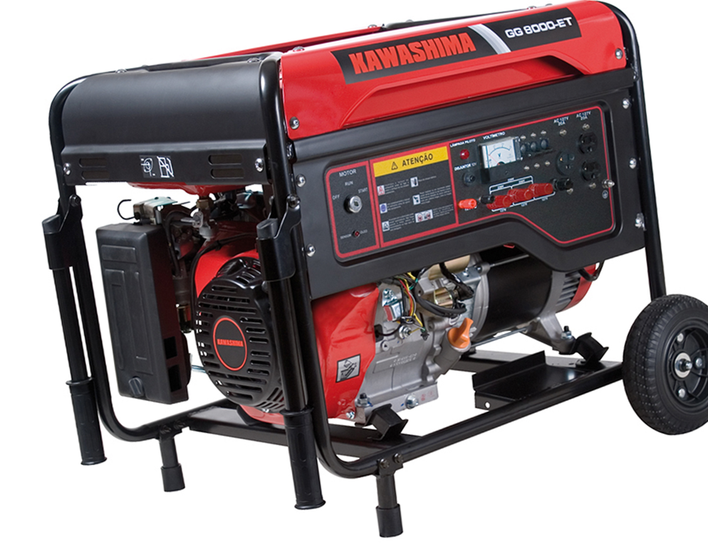 GERADOR KAWASHIMA GG 8000-ET TRIF. 380V TIPO: Gerador a gasolina, trifásico POTÊNCIA MÁXIMA: 7100 W POTÊNCIA NOMINAL: 6500 W TENSÃO: Bivolt - 380 V FREQUÊNCIA: 60 Hz CARREGADOR DE BATERIA: Sim REGULADOR DE TENSÃO (AVR): Sim VOLTÍMETRO: Sim CONSUMO DE COMBUSTÍVEL: 374 g/kwh MOTOR: Kawashima GE 1500-E TIPO DO MOTOR: Monocilíndrico, horizontal, gasolina, 4T, refrigerado a ar POTÊNCIA MÁXIMA DO MOTOR: 15 HP SISTEMA DE PARTIDA: Manual e elétrico (12V - 17A) CAPACIDADE DO TANQUE DE COMBUSTÍVEL: 24 L NÍVEL DE RUÍDO: 74 db (A) DIMENSÕES: 710x545x575 mm PESO LÍQUIDO: 87 kg