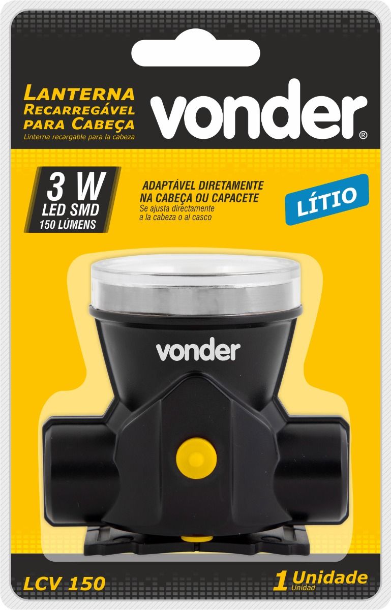 Marca: VonderConteúdo da embalagem:1 Lanterna para cabeça. Acompanha: 1 fonte de carregamento.Destaques e diferenciais:Possui LED no carregador (LED amarelo, quando está carregando/LED verde, quando está carregada). Proteção emborrachada para o conector de carregamento. Conta com bateria de lítio recarregável de 3,7 V/2.000 mAh.Aplicações e dicas de uso:Indicada para iluminação em geral. Adaptável diretamente na cabeça ou capacete.Detalhes TécnicosModelo: LCV150 Material da lanterna: Plástico ABS Cor da lanterna: Preta Fluxo luminoso (lúmen): 150 lm Tipo de lâmpada: Led SMD Alimentação da lanterna: Bateria 3,7 V 2.000 mAh recarregável - Lítio Massa aproximada (peso) (kg): 0,17 kg Garantia - E (CDC):Garantia legal: 90 dias