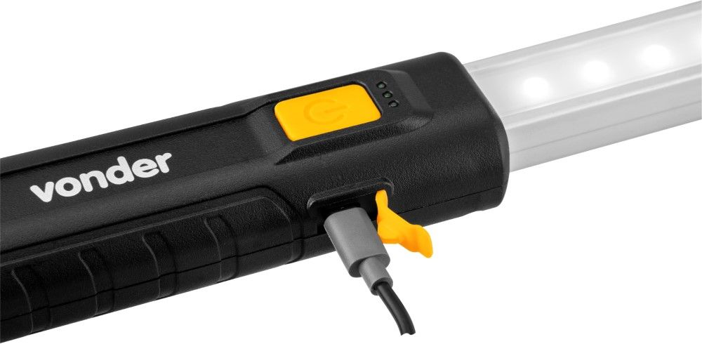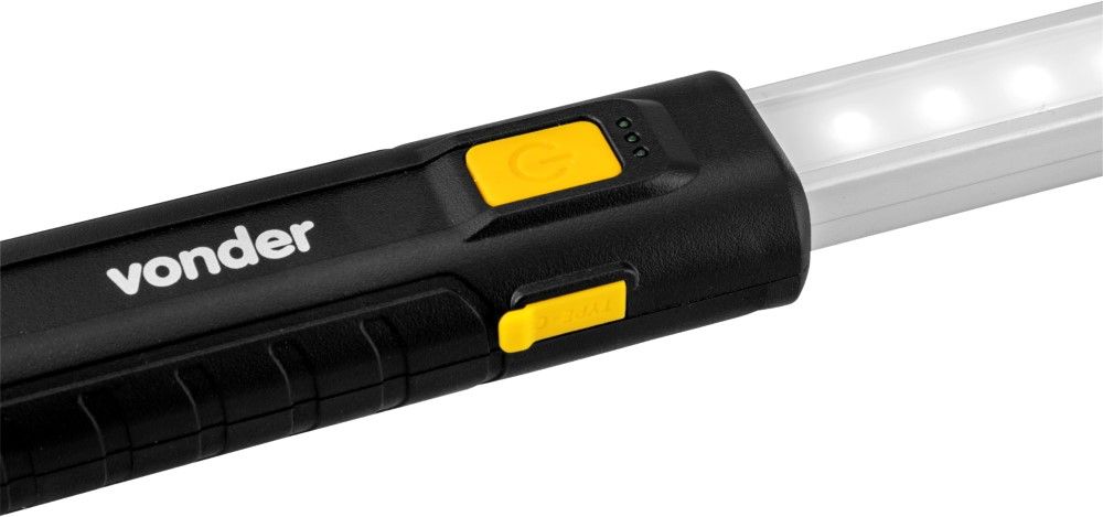 Marca: VonderCódigo: 8075362000Conteúdo da embalagem1 Lanterna. Acompanha: 1 cabo USB para carregamento.Destaques e diferenciais:Leve, prática e portátil, possui corpo em alumínio e suportes emborrachados, proporcionando maior durabilidade. Conta com bateria recarregável de Íons de Lítio e sistema rotativo em 360°, facilitando o direcionamento do foco de luz para o local desejado. Possui ainda corpo com sistema extensível e ajuste de intensidade de luminosidade, através do interruptor de acionamento, adequando-se de acordo com a necessidade do profissional, proporcionando facilidade e eficiência ao trabalho.Aplicações e dicas de uso:Indicado para iluminação em inspeções veiculares, amplamente utilizada em: cofre de motor, interiores de carros, oficinas mecânicas, centros automotivos, autoelétricas e detalhamento automotivo.Material da lanterna: Corpo em alumínio e bases com revestimento emborrachado Cor da lanterna: Amarela e preta Fluxo luminoso (lm): Nível 1: 500 Lúmens; Nível 2: 1000 Lúmens; Nível 3: 2000 Lúmens Tipo do LED: LED SMD Quantidade de LEDs da lanterna: 50 LEDs Comprimento total da lanterna: 1.170 mm fechada - 1.900 mm aberta Tempo de carga: 4 horas Autonomia aproximada: Nível 1: 6,5 horas (500 Lúmens); Nível 2: 4 horas (1000 Lúmens); Nível 3: 2 horas (2000 Lúmens) Alimentação da lanterna: Recarregável Bateria: Íons de Lítio - 3,6 V - 4.800 mAh Entrada de carregamento: USB tipo C Tensão (V): 5 V DC / 2 A - Carregamento via cabo USB tipo C (não acompanha fonte) Massa aproximada (peso) (kg): 1,1 kg Garantia - E (CDC):Garantia legal: 90 dias