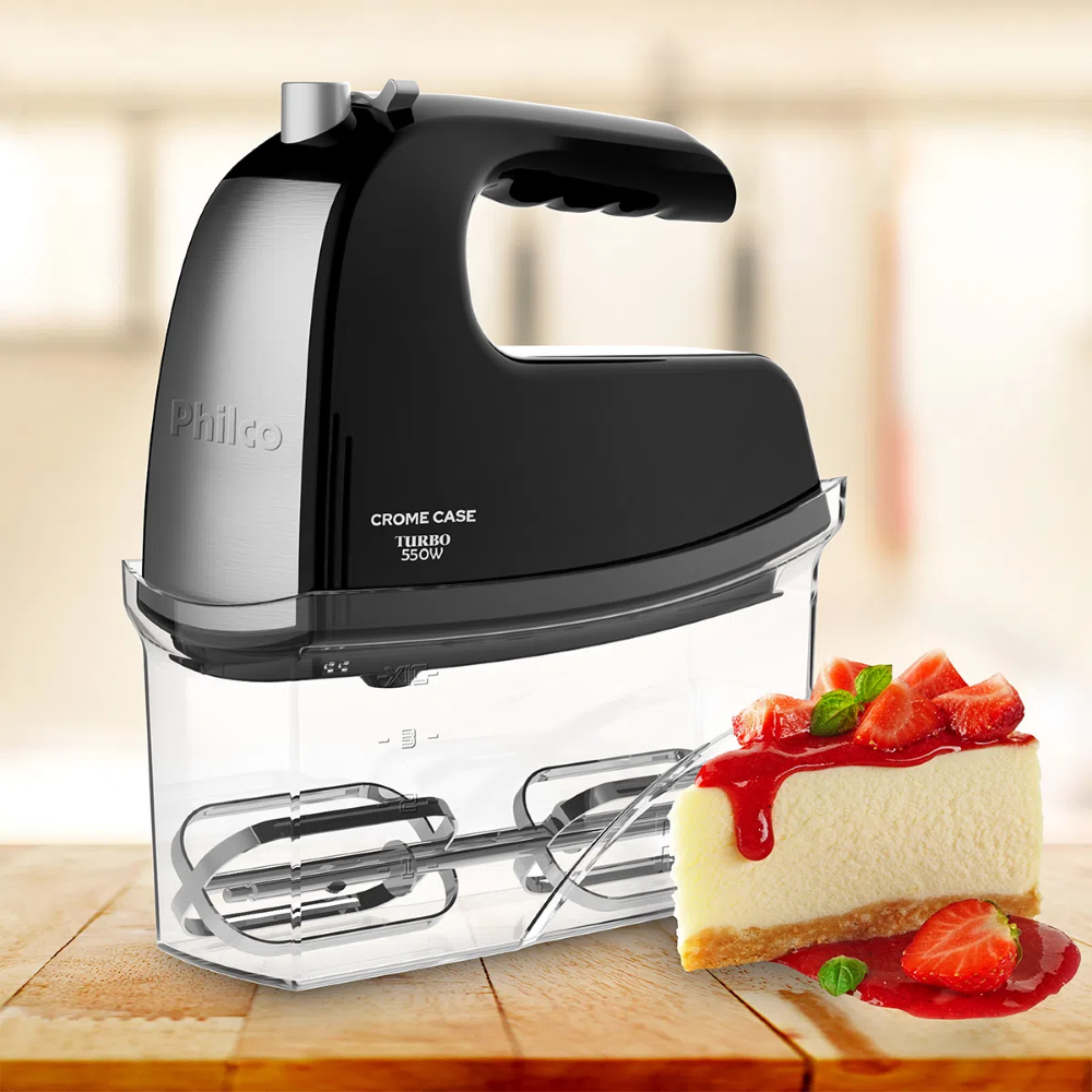 Batedeira Portátil Chrome Case PBT450P. 550W Philco Com 4 Velocidades e Acabamento Inox 220V