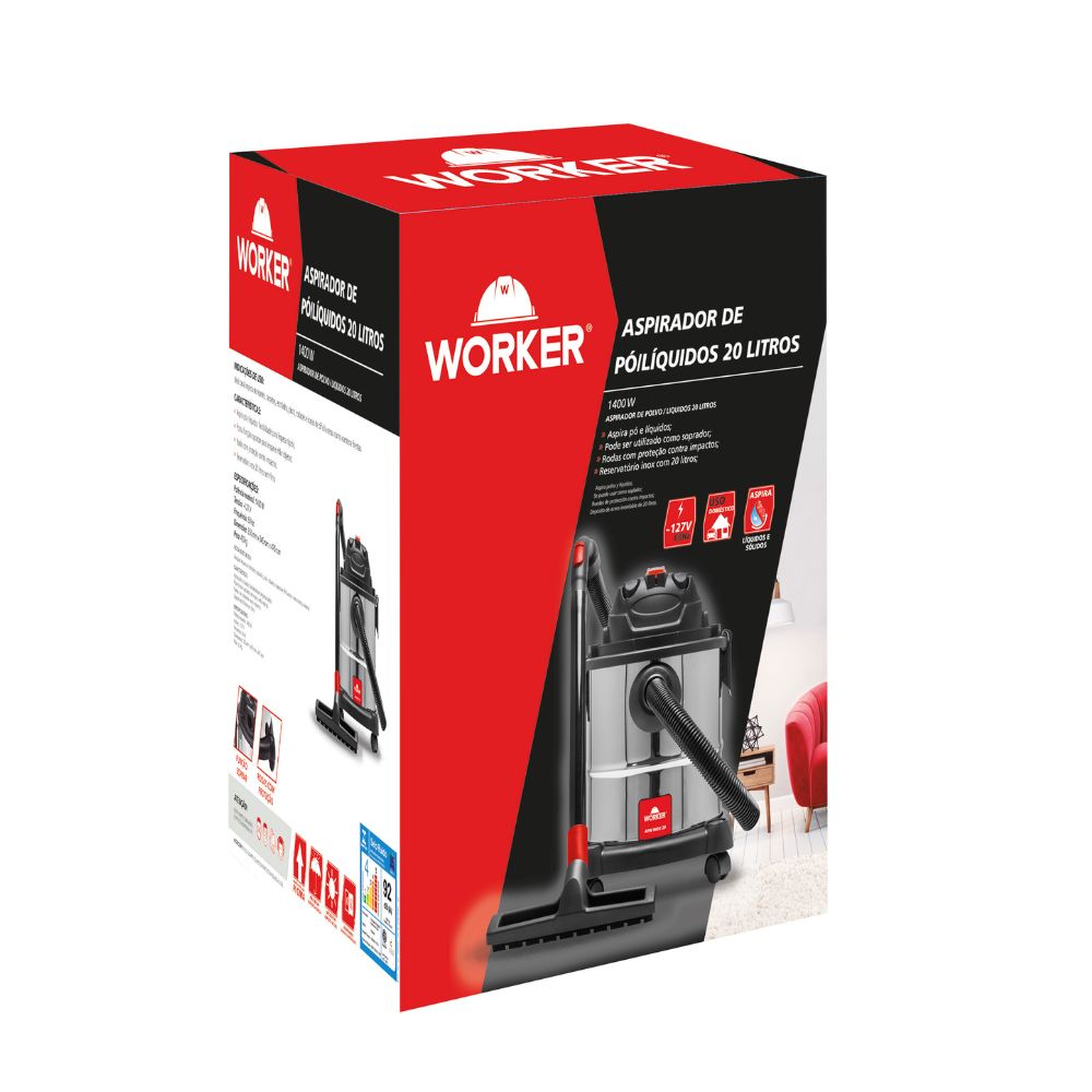 Aspirador de Pó e Água Worker 20 Litros: Limpeza Poderosa e Versátil para Toda a Casa Mantenha sua casa impecável com o Aspirador de Pó e Água Worker de 20 litros! Este aspirador potente e versátil é a solução ideal para a limpeza de pisos, tapetes, estofados, carros e outros ambientes. Com 1400W de potência e voltagem de 220V, ele remove pó, sujeira e líquidos com facilidade, proporcionando um ambiente mais limpo e saudável. A praticidade é outro ponto forte: suas rodas com proteção contra impactos, alça para transporte e diversos acessórios tornam a limpeza mais rápida e eficiente. O reservatório de aço inox de 20 litros garante maior capacidade, enquanto o filtro de água retém as partículas de sujeira, evitando que voltem para o ambiente. Além disso, a função soprador permite limpar e inflar objetos, ampliando ainda mais as possibilidades de uso. Se você busca um aspirador potente, durável e com excelente custo-benefício, o modelo Worker é a escolha certa! Especificações Capacidade: 20 Litros Potência Nominal: 1400W Frequência: 60 Hz Dimensões: 350mm x 345mm x 470mm Peso: 4 Kg Voltagem: 220 V Comprimento do cabo: 2,5 m Capacidade Para pó: 13,5 L Capacidade Para Água: 12 L Itens Inclusos Bico múltiplo Bico canto e escova Tubos prolongadores Mangueira flexível Filtro espuma Saco para pó lavável Perguntas Frequentes (FAQ) Pergunta: Qual a voltagem do aspirador?Resposta: O aspirador possui voltagem de 220V. Pergunta: Ele aspira líquidos?Resposta: Sim, o aspirador aspira tanto pó quanto líquidos, oferecendo grande versatilidade na limpeza. Pergunta: Qual a garantia do produto?Resposta: Garantia legal: 90 dias. Pergunta: O aspirador possui filtro de água?Resposta: Sim, o aspirador possui filtro de água que retém as partículas de sujeira.