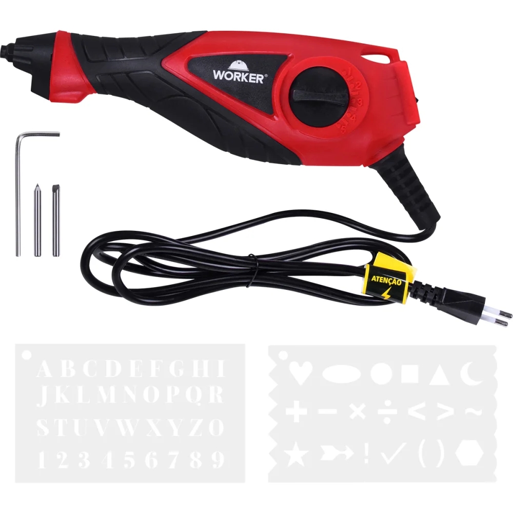 Código do Fornecedor: 964697 Marca: Worker Conteúdo da embalagem: 1 Gravador Elétrico 127V LED 9 Posições Worker O gravador Elétrico da Worker é indicado para gravação ou decoração em metais, vidros, pedras, plásticos rígidos e madeiras. A solução ideal para realizar gravação, pequeno, prático, leve e muito fácil de usar. Dispõe de um design ergonômico, que proporciona comodidade na hora do uso, garantindo resultados perfeitos. Além de sua ponta de carboneto de tungstênio, também possui uma ponta de diamante para gravuras em materiais duros e vidro. Especificação do produto: Leve e compacto Uso confortável e alto desempenho9 posições de ajusteLuz de LEDInterruptor liga/desligaPorta-ponta de gravaçãoSeletor de ajuste de pontaParafuso da ponta de gravaçãoCabo de alimentação Características Técnicas: Tensão: 127VPotência: 10WFrequência: 60HzPulsos por minuto: 7.100Posições de ajuste: 9Dimensões: 160 mm x 40 mmPeso: 360g Acompanha: 1 placa (algarismos/ alfabetos/ símbolos)2 pontas1 chave allen Garantia: 3 meses