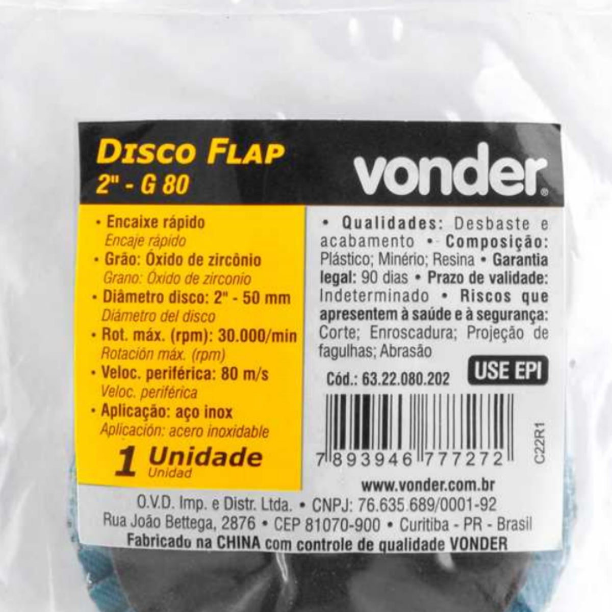 Disco de Desbaste e Acabamento Vonder Reto 2" Grão 80 Zircônio Encaixe RápidoDesenvolvido com óxido de zircônio de alta performance, esse disco é ideal para profissionais exigentes que atuam com metal, aço carbono, aço inox e ligas metálicas nas mais variadas áreas — como serralherias, funilarias, oficinas mecânicas e indústrias em geral.O grão 80 oferece o equilíbrio perfeito entre poder de remoção e acabamento refinado, sendo altamente eficiente tanto na eliminação de rebarbas quanto no nivelamento de superfícies metálicas. Com perfil reto, o disco permite acesso facilitado a áreas planas e pontos de difícil alcance, garantindo mais controle e qualidade na aplicação.Com diâmetro externo de 2" (50 mm) e encaixe rápido, o produto proporciona trocas ágeis durante o uso, otimizando o tempo em tarefas repetitivas ou em linhas de produção. O costado plástico reforçado confere resistência estrutural e leveza, assegurando uma experiência de uso mais confortável e segura mesmo em altas rotações.A rotação máxima de 30.000 rpm e a velocidade periférica de até 80 m/s posicionam este disco como uma excelente opção para equipamentos de alto desempenho, mantendo a estabilidade e segurança conforme as normas ABNT NBR ISO 15635 e ABNT NBR 16195.Especificações- Qualificação Técnica- Diâmetro externo do disco de desbaste/acabamento flap-disc: 2 " - 50 mm- Diâmetro do furo do disco de desbaste/acabamento flap-disc: Encaixe rápido- Grão: G 80- Tipo do grão abrasivo: Óxido de zircônio- Tipo de costado: Plástico- Tipo do perfil do disco de desbaste/acabamento flap-disc: Reto- Rotação máxima (rpm): 30.000/min- Velocidade periférica (máx.): 80 m/s- Velocidade periférica (máx.): 80 m/s- Norma de referência: ABNT NBR ISO 15635 / ABNT NBR 16195- Massa aproximada (peso) (kg): 0,013 kgItens inclusos- 01 Disco Flap Reto 2" Grão 80 Zircônio Encaixe Rápido VonderGarantia- 03 meses com o fabricante