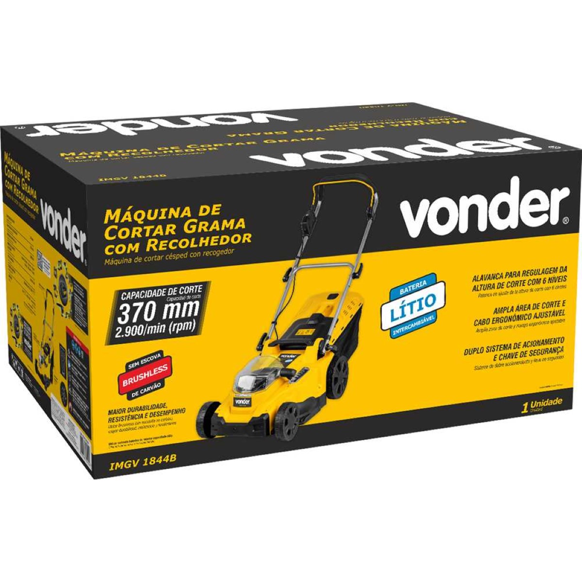 Cod. Fornecedor: 6004184400Marca: Vonder Conteúdo da embalagem: 1 Máquina para cortar grama. Acompanha: 1 lâmina de 370 mm e 1 recolhedor.Destaques e diferenciais: Este equipamento utiliza um modelo de bateria que pode ser intercambiável (não acompanha), ou seja, uma bateria que é compatível com outros modelos de ferramentas a bateria VONDER. Por isso, em sua próxima compra de ferramenta a bateria VONDER, procure um modelo que comece com a referência “I”, ou que esteja identificado com o selo “Bateria Intercambiável VONDER”. Desta forma, você garante modelos mais econômicos, sem a necessidade de aquisição de novas baterias e carregadores para uso em seu equipamento. Portátil, prático, eficiente, possui duplo sistema de acionamento e chave de segurança, proporcionando maior segurança ao operador e impedindo o acionamento acidental da máquina. Conta ainda com alavanca para regulagem da altura de corte com 6 níveis e recolhedor de grama. Possui ampla área de corte e cabo ergonômico ajustável, oferecendo maior agilidade e conforto ao operador, além de motor Brushless (sem escova de carvão), que garante maior durabilidade, resistência e desempenho.Aplicações e dicas de uso: Indicada para cortar grama em jardins residenciais. Capacidade do recolhedor: 35 litros. Funcionamento apenas com duas baterias (utilizar baterias de mesma capacidade (Ah)). Não acompanha bateria e carregador.BATERIAS INDICADAS:(4 Ah) IBV 1804 - 60.04.180.400(5 Ah) IBV 1850 - 60.04.185.000(8 Ah) IBV 1880 - 60.04.188.000CARREGADORES INDICADOS:Carregamento convencional ICBV 1805 - 60.04.180.500Carregamento convencional duplo ICBV 1841- 60.04.184.100Carregamento rápido ICBV 1806 - 60.04.180.600Carregamento rápido duplo ICBV 1842 - 60.04.184.200Carregador inteligente ICBV 1849 - 60.04.184.900Carregador convencional com conector automotivo 12 V ICBV 1843 - 60.04.184.300.Garantia legal: 1 anoQualificação TécnicaModelo: IMGV1844B Linha: Doméstico Tipo da máquina para cortar grama: Com recolhedor Capacidade de corte (largura máxima): 370 mm Recolhedor: 35 litros Número de ajustes de altura da máquina para cortar grama: 6 Níveis (25 mm – 35 mm – 45 mm – 55 mm – 65 mm - 75 mm) Rotações por minuto (rpm): 2.900/min Material da roda: Plástico Tensão da bateria (V): 2 Baterias de 18 V (36 V) Tensão do carregador de bateria (V~): Não acompanha carregador Massa aproximada (peso) (kg): 14,3 kg