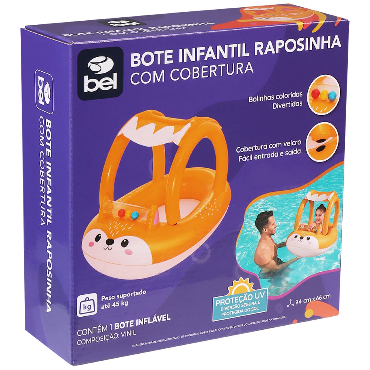 Bote Infantil Raposinha Bel: Aventura Aquática Segura e Divertida Transforme os dias de sol em momentos inesquecíveis com o Bote Infantil Raposinha da Bel! Projetado para crianças a partir de 3 anos, este bote combina segurança, conforto e muita diversão na água. Fabricado com vinil super-resistente, garante durabilidade e tranquilidade durante as brincadeiras. A cobertura com velcro e proteção UV protege seu pequeno dos raios solares, proporcionando sombra e bem-estar em dias quentes. O design lúdico em formato de raposinha estimula a imaginação e torna a experiência ainda mais encantadora. Além disso, o tubo com três bolinhas coloridas flutuantes estimula a coordenação visual e a curiosidade dos pequenos aventureiros. Com capacidade para suportar até 45 kg, o Bote Raposinha Bel é perfeito para garantir horas de alegria e segurança na piscina ou no mar. Deixe a diversão fluir com a qualidade e o carinho que só a Bel oferecem! Especificações Material: Vinil super-resistente Proteção UV: Sim, na cobertura Capacidade de Peso: Até 45 kg Idade Recomendada: A partir de 3 anos Design: Raposinha Acessórios: Tubo com 3 bolinhas flutuantes Itens Inclusos Bote Infantil Raposinha Bel Perguntas Frequentes (FAQ) Pergunta: Qual a idade mínima recomendada para usar o bote?Resposta: O Bote Infantil Raposinha Bel é recomendado para crianças a partir de 3 anos. Pergunta: O bote oferece proteção contra o sol?Resposta: Sim, a cobertura do bote possui proteção UV para proteger a criança dos raios solares. Pergunta: Qual o peso máximo suportado pelo bote?Resposta: O bote suporta até 45 kg. Pergunta: O bote vem com algum acessório?Resposta: Sim, o bote acompanha um tubo com 3 bolinhas coloridas flutuantes. Pergunta: Qual a garantia do produto?Resposta: Garantia legal: 90 dias