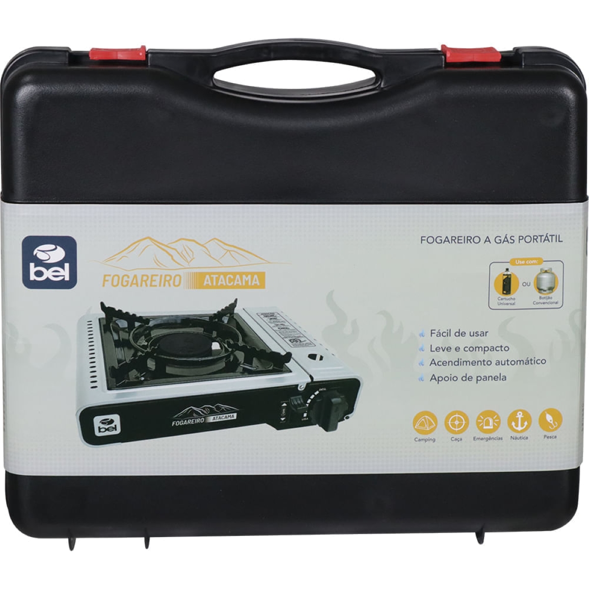 Fogareiro a Gás Atacama: Cozinhe com Praticidade e Segurança em Suas Aventuras Leve a praticidade e a potência da Bel para suas aventuras ao ar livre com o Fogareiro a Gás Atacama! Projetado para quem busca eficiência e segurança, este fogareiro compacto é perfeito para camping, pesca, caça, náutica ou simplesmente para ter em casa como uma opção prática para cozinhar. O sistema de acendimento automático elimina a necessidade de fósforos ou isqueiros, permitindo que você prepare suas refeições em segundos. Sua chama ajustável oferece controle preciso da temperatura, ideal para diferentes tipos de preparo. A base de apoio da panela é robusta e garante estabilidade durante o uso, evitando acidentes e proporcionando mais confiança. Além disso, o Fogareiro Atacama é leve e compacto, facilitando o transporte e o armazenamento. Acompanha uma maleta resistente para proteger o fogareiro durante suas viagens. Invista em um fogareiro que combina desempenho, segurança e portabilidade, elevando sua experiência gastronômica ao ar livre. Especificações Sistema de Acendimento: Automático Tipo de Gás: Gás Butano/Propano Potência Térmica: Não especificado Dimensões aproximadas montado (C x L x A): 35 cm x 9,0 cm x 30 cm Itens Inclusos Fogareiro a Gás Atacama Maleta de Transporte Perguntas Frequentes (FAQ) Pergunta: O fogareiro é fácil de usar?Resposta: Sim, o Fogareiro Atacama possui acendimento automático e chama ajustável, tornando-o muito fácil de usar, mesmo para iniciantes. Pergunta: É seguro usar o fogareiro em ambientes fechados?Resposta: Não recomendamos o uso do fogareiro em ambientes totalmente fechados. Utilize-o em áreas bem ventiladas para garantir a segurança. Pergunta: Qual o tipo de gás compatível com o fogareiro?Resposta: O fogareiro é compatível com gás butano/propano. Pergunta: O fogareiro acompanha regulador de pressão?Resposta: Informação não disponível. Pergunta: Qual a garantia do produto?Resposta: Garantia legal: 90 dias