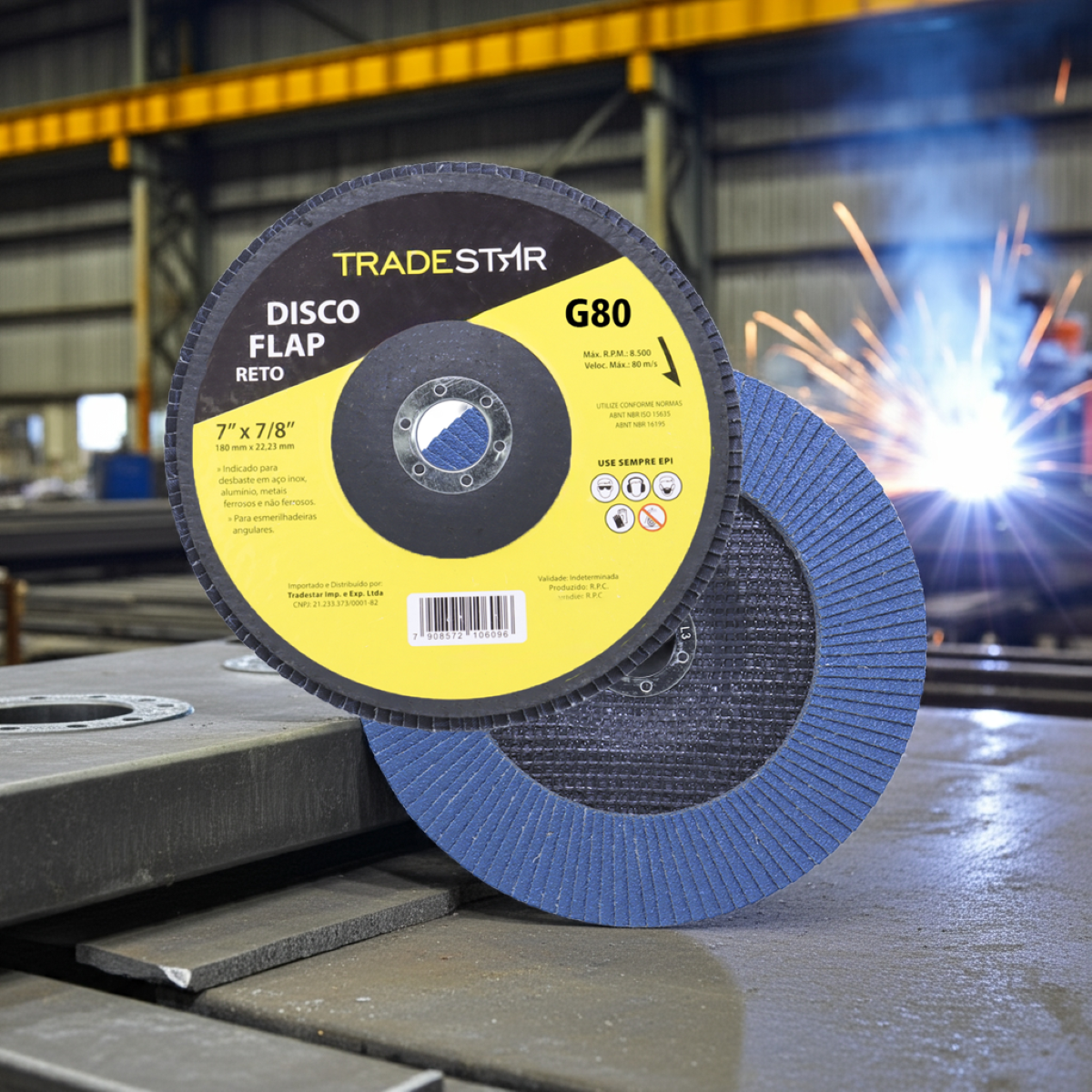 Disco de Desbaste Tradestar 180 mm G80 Fibra Reto Azul Aço e InoxO Disco de Desbaste Tradestar 180 mm G80 Fibra Reto Azul é a escolha ideal para quem busca eficiência, durabilidade e resultados profissionais em trabalhos de desbaste e acabamento em metais. Projetado especialmente para aplicações em aço e inox, este disco flap une qualidade e desempenho, atendendo tanto às necessidades de profissionais do setor industrial quanto de entusiastas do faça-você-mesmo.Sua construção em abrasivo de óxido de alumínio de alta performance garante corte e desbaste precisos, removendo material com rapidez e deixando um acabamento uniforme. O formato reto é ideal para superfícies planas, proporcionando maior estabilidade e controle durante a operação, o que se traduz em trabalhos mais seguros e acabamentos consistentes.O diâmetro de 180 mm (7”) e o furo central de 22,23 mm garantem compatibilidade com a maioria das lixadeiras angulares disponíveis no mercado. Além disso, o suporte de fibra de vidro de alta resistência confere robustez, durabilidade e maior segurança durante o uso, reduzindo riscos de quebra e prolongando a vida útil da ferramenta.Outro destaque é sua capacidade de operação em rotações de até 8.500 RPM, suportando velocidades de até 80 m/s sem comprometer o desempenho ou a segurança do operador. Essa característica faz do Disco Tradestar uma ferramenta confiável tanto para operações intensas quanto para trabalhos mais delicaSeja no ambiente profissional ou em projetos pessoais, o Disco Flap Tradestar 180 mm G80 Fibra Reto Azul Aço e Inox é sinônimo de eficiência e acabamento de qualidade, representando uma excelente relação custo-benefício para quem busca ferramentas abrasivas confiáveis.Especificações- Abrasivo: Óxido de alumínio- Grão: G80- Dimensões: 180 mm- Diâmetro do furo: 22,23 mm- Rotação máxima: 8.500 RPM- Velocidade máxima: 80 m/s- Suporte: Fibra de vidro de alta resistência- Indicação de uso: Desbaste e acabamento de Azul Aço e Inox carbono, Azul Aço e Inox inox, alumínio, metais ferrosos e não ferrososItens inclusos- 1 Flap Disc 180 mm G80 Fibra Fibra Reto Azul Aço e InoxGarantia- 03 meses com o Fabricante