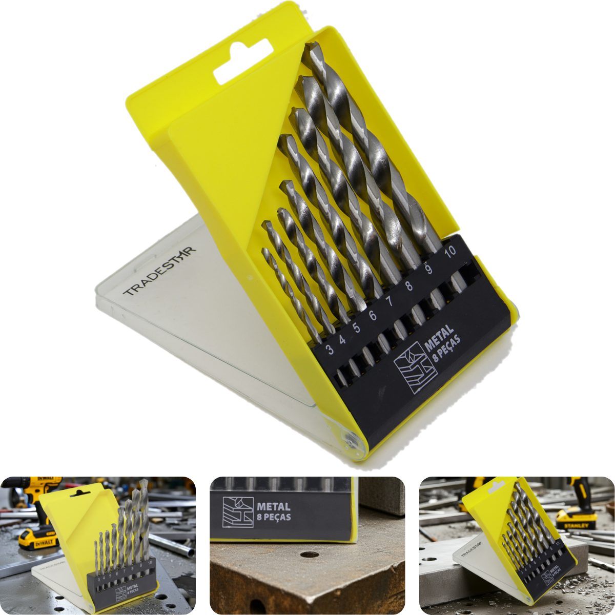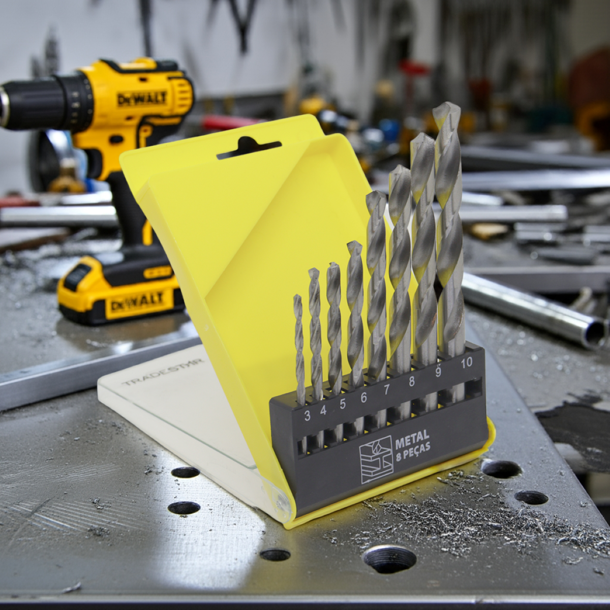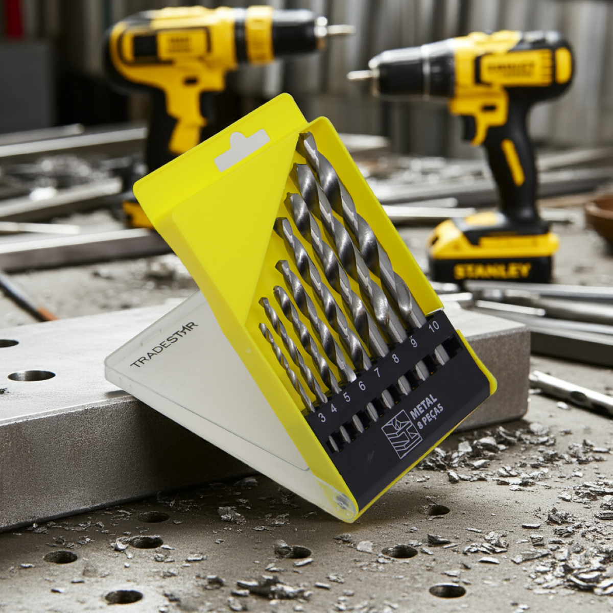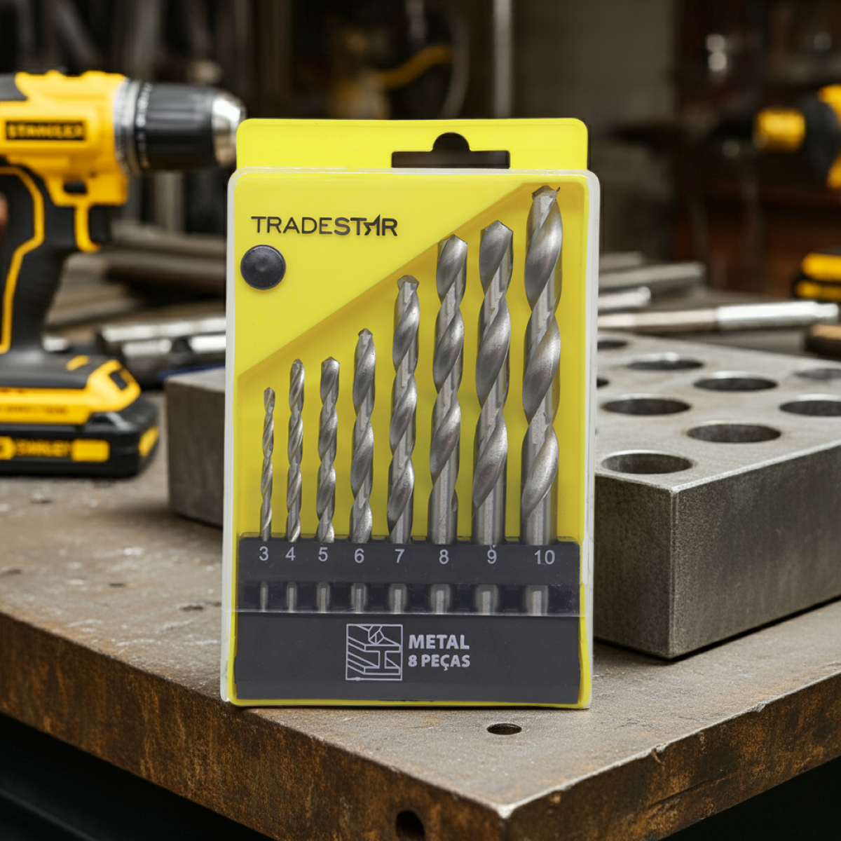 Jogo de Brocas para Metal Tradestar 3 até 10 mm 8 PeçasO Jogo de Brocas Tradestar para Metal é a escolha ideal para quem busca precisão, resistência e alto desempenho em perfurações de metais e chapas metálicas. Produzido em aço de alta qualidade com tratamento especial, garante maior durabilidade e eficiência, sendo indicado tanto para uso profissional quanto doméstico.Composto por 8 brocas nos tamanhos de 3 mm a 10 mm, este kit é versátil e atende às mais diversas aplicações em serralherias, oficinas, construções, manutenções e até mesmo em projetos de faça-você-mesmo (DIY). Seu design helicoidal proporciona cortes rápidos, furos limpos e melhor evacuação de cavacos, evitando travamentos durante o trabalho. Além disso, essas brocas são compatíveis com furadeiras elétricas e a bateria, tornando-se um acessório essencial para perfurações em aço, ferro, alumínio e outros metais não ferrosos.Especificações- Material: Aço de alta resistência com tratamento especial- Tipo: Brocas helicoidais para metal- Aplicações: Perfuração de metais ferrosos e não ferrosos, chapas metálicas e estruturas metálicasItens inclusos- Broca 3 mm x 60 mm- Broca 4 mm x 75 mm- Broca 5 mm x 85 mm- Broca 6 mm x 100 mm- Broca 7 mm x 105 mm- Broca 8 mm x 105 mm- Broca 9 mm x 115 mm- Broca 10 mm x 120 mmGarantia- 03 meses com o Fabricante