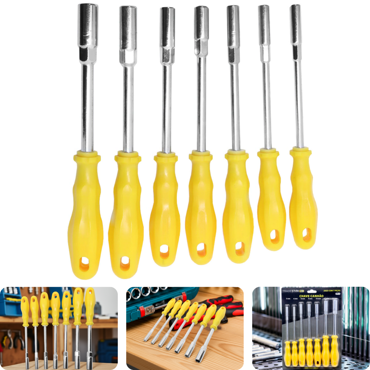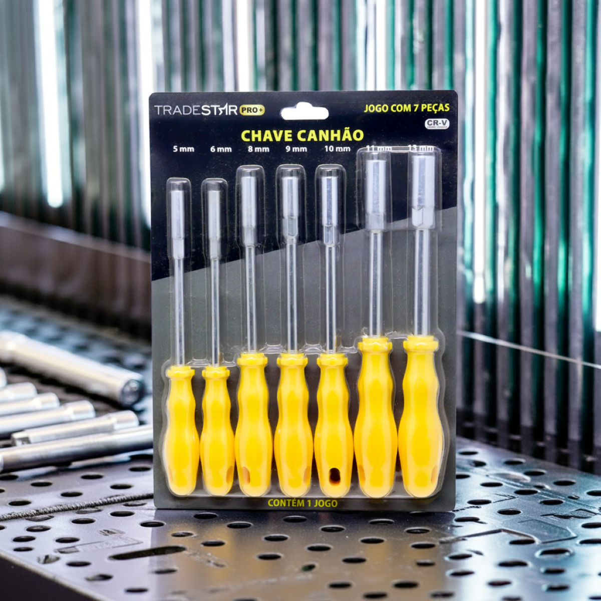 Kit Chaves Canhão Tradestar Sextavada 7 peças 5 mm até 13 mm Cromo VanádioO Kit Jogo de Chave Canhão Tradestar Sextavada 7 Peças é a escolha ideal para profissionais e hobbistas que precisam de uma ferramenta resistente, versátil e duradoura. Produzido em aço Cromo Vanádio, material reconhecido mundialmente por sua alta resistência mecânica e longa vida útil, este conjunto garante excelente desempenho em aplicações intensas, seja em oficinas, instalações elétricas, manutenção automotiva, marcenaria ou reparos domésticos.Composto por 7 peças nos tamanhos 5 mm, 6 mm, 7 mm, 8 mm, 9 mm, 10 mm e 13 mm, o kit cobre uma ampla faixa de medidas, oferecendo a solução adequada para diferentes tipos de parafusos sextavados. Essa variedade torna o jogo indispensável para quem busca praticidade e eficiência em seus trabalhos do dia a dia.O design alongado da chave canhão possibilita alcançar parafusos em áreas de difícil acesso, facilitando o aperto e o desaperto em locais estreitos ou profundos. Além disso, o formato ergonômico permite uma pegada firme e confortável, reduzindo o esforço do usuário e garantindo maior precisão nas tarefas.Outro diferencial importante é o acabamento cromado, que além de proporcionar um visual sofisticado, protege as ferramentas contra oxidação e corrosão, aumentando a durabilidade e facilitando a limpeza. Isso significa que o kit mantém sua aparência e desempenho mesmo após longos períodos de uso contínuo.Especificações- Acabamento: Cromado, resistente à corrosão- Formato: Alongado, ideal para locais estreitos e profundos- Medidas: 5 mm / 6 mm / 7 mm / 8 mm / 9 mm / 10 mm / 13 mmItens inclusos- 1 Jogo Chave Canhão 5 - 13 mm 7 Peças Cromo VanádioGarantia- 03 meses com o Fabricante