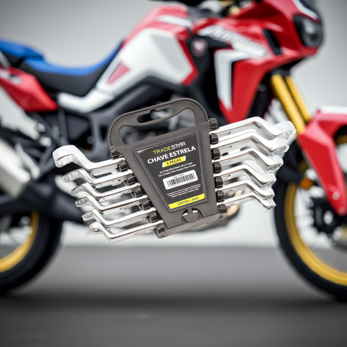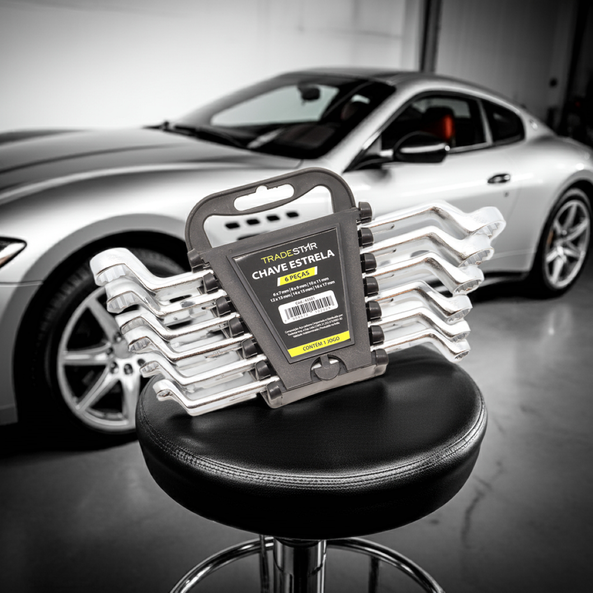 Jogo Chave Estrela Tradestar 6mm até 17 mm 6 Peças Aço CarbonoO Jogo de Chaves Estrela Tradestar 6 Peças é a ferramenta certa para quem busca resistência, precisão e praticidade no dia a dia. Produzidas em aço carbono de alta qualidade, as chaves oferecem excelente durabilidade e suportam o uso constante em atividades profissionais ou domésticas.Este conjunto inclui 6 chaves de medidas duplas: 6x7 mm, 8x9 mm, 10x11 mm, 12x13 mm, 14x15 mm e 16x17 mm. Com esse intervalo abrangente, o kit garante versatilidade para trabalhar em diferentes tipos de porcas e parafusos sextavados.As chaves tipo estrela são projetadas para envolver totalmente a cabeça do parafuso ou da porca, oferecendo maior firmeza no encaixe e reduzindo o risco de desgaste ou arredondamento das peças. Isso proporciona um torque mais eficiente e seguro em comparação com outros tipos de chaves.O formato ergonômico das ferramentas proporciona conforto no manuseio, permitindo trabalhos prolongados sem esforço excessivo. Além disso, o acabamento em aço carbono protege contra corrosão, prolongando a vida útil do kit.Compacto e prático, o Jogo de Chaves Estrela Tradestar é indispensável para mecânicos, montadores, eletricistas, profissionais de manutenção e também para quem deseja contar com ferramentas confiáveis em casa.Especificações- Medidas: 6x7 mm / 8x9 mm / 10x11 mm / 12x13 mm / 14x15 mm / 16x17 mm- Quantidade de peças: 6 unidades- Acabamento: Tratamento especial contra oxidação- Uso: Aperto e soltura de porcas e parafusos sextavadosItens inclusos- 1 Jogo Chave Estrela 6 - 17 mm 6 Peças Aço CarbonoGarantia- 03 meses com o Fabricante