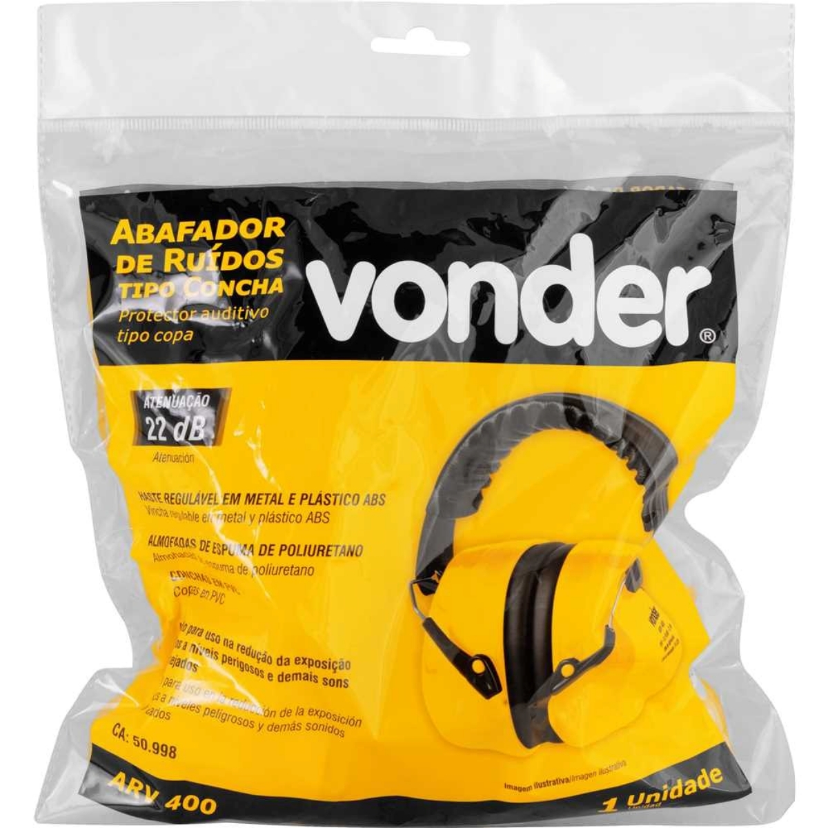 Abafador de Ruídos Concha 22dB Vonder ARV400 – Proteção e Conforto Proteja sua audição com o Abafador de Ruídos Concha ARV400 da Vonder! Projetado para reduzir a exposição a ruídos prejudiciais em diversos ambientes, este abafador oferece segurança e conforto durante suas atividades. Com atenuação de 22dB (NRRsf), ele é ideal para uso em indústrias, construção civil, aeroportos, oficinas mecânicas e eventos com sons elevados. A haste regulável em metal e plástico ABS garante um ajuste perfeito e seguro para diferentes tamanhos de cabeça, enquanto as almofadas de espuma de poliuretano proporcionam conforto prolongado, mesmo durante longas jornadas de trabalho. As conchas em PVC oferecem durabilidade e resistência, assegurando uma proteção eficaz contra ruídos indesejados. Leve, com apenas 0,300 kg, este abafador não incomoda e permite que você se concentre em suas tarefas com tranquilidade. Invista na sua saúde auditiva com a qualidade e confiabilidade Vonder. Especificações Modelo: ARV400 Atenuação - NRRsf: 22 dB Cor do abafador de ruídos: Amarelo e Preto Material da haste do abafador de ruído: Metal e Plástico ABS Massa aproximada (peso): 0,300 kg Itens Inclusos 1 Abafador de ruídos tipo concha Perguntas Frequentes (FAQ) Pergunta: Qual o nível de atenuação deste abafador?Resposta: O abafador ARV400 possui atenuação de 22dB (NRRsf). Pergunta: O abafador é ajustável?Resposta: Sim, a haste do abafador é regulável, permitindo um ajuste confortável para diferentes tamanhos de cabeça. Pergunta: Qual a garantia do produto?Resposta: Garantia legal: 90 dias.