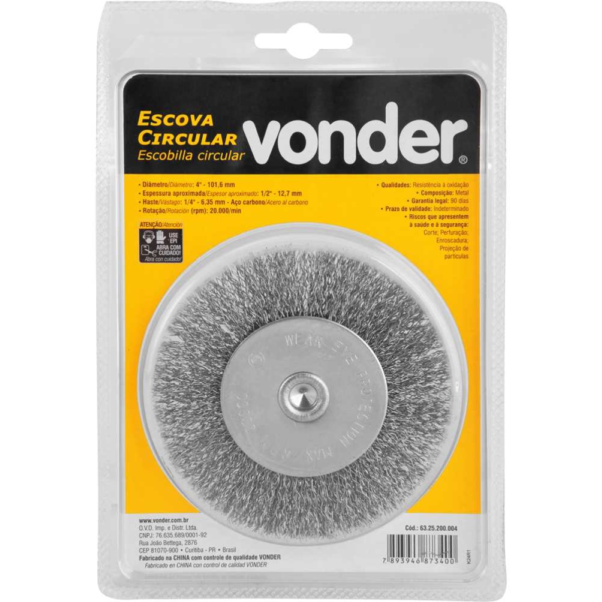 Escova Circular de Aço Inox Vonder: Limpeza Pesada com Durabilidade Remova ferrugem, sujeira incrustada e prepare superfícies com a Escova Circular Vonder. Projetada para oferecer alta performance em limpezas pesadas, esta escova possui cerdas em aço inoxidável que garantem resistência à oxidação, prolongando a vida útil da ferramenta. Com diâmetro de 4'' (101,6 mm) e espessura de 1/2'' (12,7 mm), é ideal para uso em furadeiras e retificadeiras com haste de 1/4'' (6,35 mm). Suporta rotações de até 20.000 rpm, otimizando o tempo de trabalho e a eficiência da limpeza. A haste em aço carbono oferece robustez e segurança durante o uso. Perfeita para profissionais e entusiastas que buscam uma ferramenta confiável e durável para diversas aplicações, desde a remoção de tinta até a preparação de metais para soldagem ou pintura. Especificações Diâmetro: 4'' (101,6 mm) Espessura: 1/2'' (12,7 mm) Diâmetro do fio: 0,25 mm Rotações por minuto (rpm): 20.000/min Haste: 1/4'' (6,35 mm) Material das cerdas: Aço inoxidável Material da haste: Aço carbono Peso aproximado: 0,150 kg Itens Inclusos 1 Escova circular Perguntas Frequentes (FAQ) Pergunta: Qual o material das cerdas?Resposta: As cerdas são fabricadas em aço inoxidável, proporcionando alta resistência à oxidação. Pergunta: Qual o tipo de haste?Resposta: A haste é de 1/4'' (6,35 mm) em aço carbono. Pergunta: Essa escova serve para qual tipo de ferramenta?Resposta: É indicada para uso em furadeiras e retificadeiras, desde que não exceda a rotação máxima da escova. Pergunta: Qual a garantia do produto?Resposta: Garantia legal: 90 dias