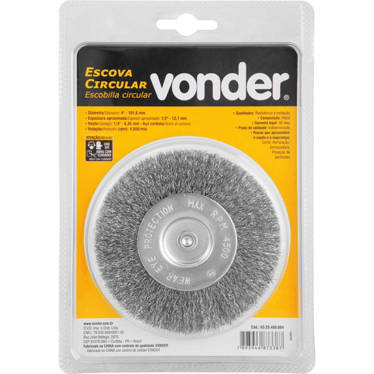 Escova Circular Vonder para Limpeza Pesada: Aço Inox e Alta Performance Remova sujeiras difíceis e prepare superfícies com a Escova Circular Vonder de 4 polegadas. Ideal para uso em furadeiras, esta escova oferece alta eficiência na limpeza, graças às suas cerdas onduladas em aço inoxidável, que garantem resistência à oxidação e durabilidade. Com diâmetro de 101,6 mm e espessura de 12,7 mm, a escova é projetada para alcançar áreas de difícil acesso e remover resíduos com facilidade. Sua haste de 1/4'' (6,35 mm) assegura compatibilidade com diversas furadeiras, tornando-a uma ferramenta versátil para profissionais e usuários domésticos. A capacidade de rotação de até 4.500 rpm otimiza o tempo de trabalho e proporciona resultados superiores. Perfeita para limpeza de metais, remoção de ferrugem, preparação de superfícies para pintura e muito mais. Invista em qualidade e eficiência para suas tarefas de limpeza com a Escova Circular Vonder. Especificações Diâmetro: 4'' (101,6 mm) Espessura: 1/2'' (12,7 mm) Diâmetro do fio: 0,25 mm Rotações por minuto (rpm): 4.500 Haste: 1/4'' (6,35 mm) Material das cerdas: Aço inoxidável Material da haste: Aço carbono Peso aproximado: 0,150 kg Itens Inclusos 1 Escova circular Vonder Perguntas Frequentes (FAQ) Pergunta: Qual o material das cerdas da escova?Resposta: As cerdas são fabricadas em aço inoxidável, proporcionando alta resistência à oxidação. Pergunta: A escova é compatível com qual tipo de ferramenta?Resposta: A escova é projetada para ser utilizada em furadeiras com haste de 1/4''. Pergunta: Qual a garantia do produto?Resposta: Garantia legal: 90 dias.