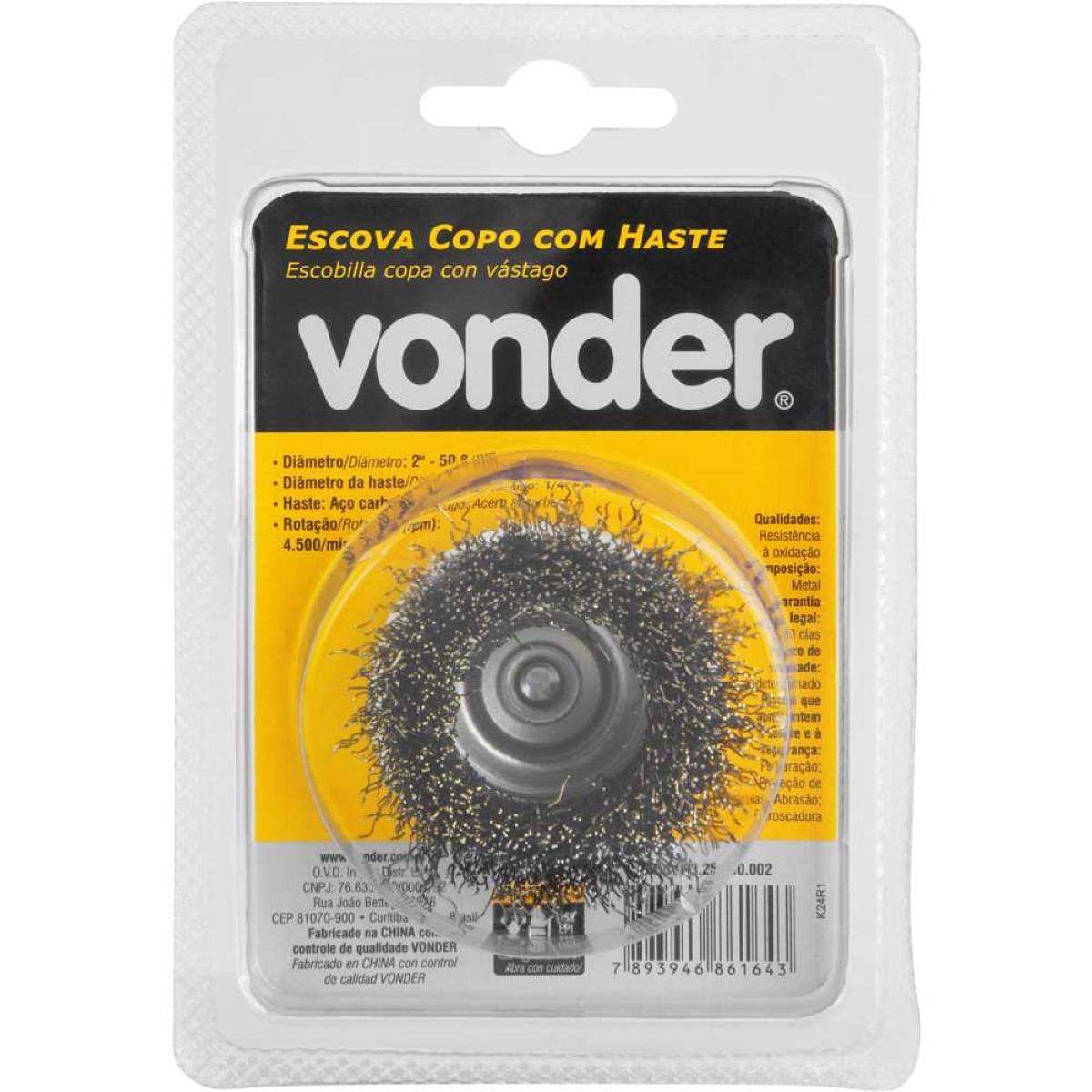 Escova Copo 2'' para Limpeza Pesada com Aço Inox Vonder Remova sujeiras difíceis e prepare superfícies com a Escova Copo Vonder de 2''. Ideal para quem busca eficiência e durabilidade em limpezas industriais, automotivas ou em projetos de bricolagem, esta escova oferece cerdas em aço inoxidável que resistem à oxidação, garantindo uma vida útil prolongada. Com diâmetro de 50,8 mm e haste de 6,3 mm (1/4''), é compatível com a maioria das furadeiras, permitindo alcançar uma rotação de até 4.500 rpm para uma limpeza rápida e eficaz. Sua construção em aço carbono garante robustez e segurança durante o uso. Leve e fácil de manusear, com apenas 72 gramas, a Escova Copo Vonder é a ferramenta perfeita para desengordurar, remover ferrugem e preparar superfícies para pintura ou aplicação de revestimentos. Invista em qualidade e otimize seu tempo com a Escova Copo Vonder! Especificações Diâmetro da haste: 6,3 mm (1/4'') Diâmetro externo da escova: 50,8 mm (2'') Material das cerdas: Aço inoxidável Material da haste: Aço carbono Rotação máxima: 4.500 rpm Peso aproximado: 0,072 kg Itens Inclusos 1 Escova Copo 2'' Vonder Perguntas Frequentes (FAQ) Pergunta: Qual o material das cerdas?Resposta: As cerdas são fabricadas em aço inoxidável, proporcionando alta resistência à oxidação. Pergunta: Essa escova serve para qual tipo de furadeira?Resposta: A escova possui haste de 6,3 mm (1/4''), compatível com a maioria das furadeiras. Pergunta: Qual a garantia do produto?Resposta: Garantia legal: 90 dias.