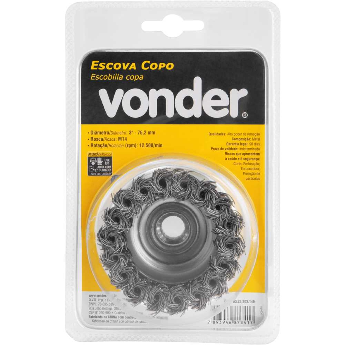 Escova Copo 3'' Vonder: Limpeza Pesada com Máxima Eficiência Remova ferrugem, tinta e resíduos com a Escova Copo 3'' da Vonder! Projetada para uso em esmerilhadeiras angulares de 4.1/2", esta escova oferece um poder de remoção superior graças às suas cerdas em aço carbono torcido. Ideal para profissionais e entusiastas que buscam resultados rápidos e eficazes em trabalhos de limpeza, preparação de superfícies e restauração. Com diâmetro de 76,2 mm e rosca M14, garante compatibilidade e segurança durante o uso. As cerdas de 0,50 mm de diâmetro são robustas e duráveis, proporcionando uma longa vida útil mesmo em aplicações exigentes. A alta capacidade de rotação, atingindo 12.500 rpm, otimiza o desempenho e reduz o tempo de trabalho. Leve e fácil de manusear, com apenas 0,420 kg, a Escova Copo Vonder é a ferramenta perfeita para quem busca qualidade e praticidade. Especificações Material das cerdas: Aço Carbono Tipo de cerdas: Torcida Diâmetro: 76,2 mm Diâmetro do fio: 0,50 mm Rosca: M14 Rotações por minuto (rpm): 12.500 Massa aproximada: 0,420 kg Itens Inclusos 1 Escova Copo 3'' Vonder Perguntas Frequentes (FAQ) Pergunta: Qual o tipo de esmerilhadeira compatível com esta escova?Resposta: Esta escova é compatível com esmerilhadeiras angulares de 4.1/2". Pergunta: Qual a durabilidade da escova?Resposta: A escova é fabricada com aço carbono de alta qualidade, garantindo durabilidade mesmo em uso intenso. Pergunta: A escova remove ferrugem?Resposta: Sim, a escova é ideal para remover ferrugem, tinta e outros resíduos de superfícies metálicas. Pergunta: Qual a garantia do produto?Resposta: Garantia legal: 90 dias