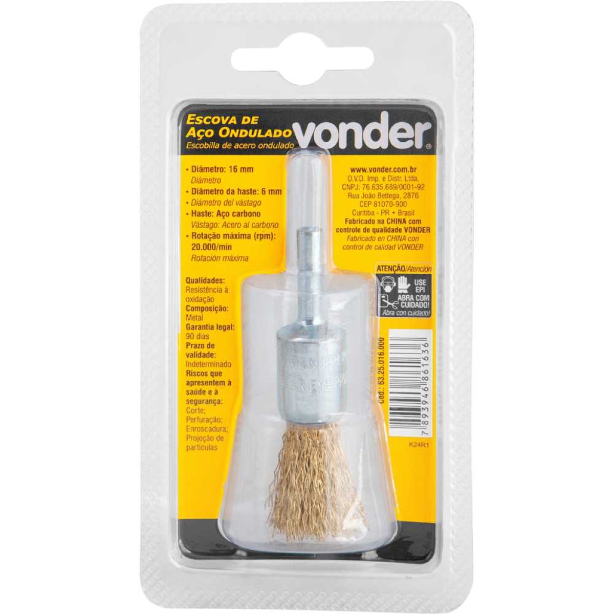 Escova Pincel Vonder para Limpeza Pesada – 16mm, 20.000 RPM A Escova Pincel Vonder de 16mm é a solução ideal para quem busca eficiência e durabilidade em limpezas que exigem mais. Projetada com cerdas em aço carbono latonado, esta escova oferece excelente resistência à oxidação, garantindo uma vida útil prolongada mesmo em ambientes úmidos ou agressivos. Com diâmetro de 16mm e haste de 6mm, é compatível com a maioria das furadeiras e retificadeiras, permitindo alcançar áreas de difícil acesso e remover sujeiras incrustadas com facilidade. Sua rotação máxima de 20.000 RPM proporciona um poder de limpeza superior, economizando tempo e esforço. Seja para trabalhos domésticos, oficinas mecânicas ou aplicações industriais, a Escova Pincel Vonder é a ferramenta certa para um resultado impecável. Leve, compacta e com apenas 35 gramas, oferece manuseio confortável e preciso. Invista em qualidade e desempenho com a Vonder! Especificações Material das cerdas: Aço carbono latonado Diâmetro: 16 mm Diâmetro da haste: 6 mm Rotação máxima: 20.000 RPM Massa aproximada: 0,035 kg Itens Inclusos 1 Escova pincel Vonder Perguntas Frequentes (FAQ) Pergunta: Qual o material das cerdas?Resposta: As cerdas são fabricadas em aço carbono com acabamento latonado, proporcionando resistência à oxidação. Pergunta: Essa escova serve para qual tipo de ferramenta?Resposta: É compatível com furadeiras e retificadeiras, desde que a rotação não exceda 20.000 RPM. Pergunta: Qual a garantia do produto?Resposta: Garantia legal: 90 dias.