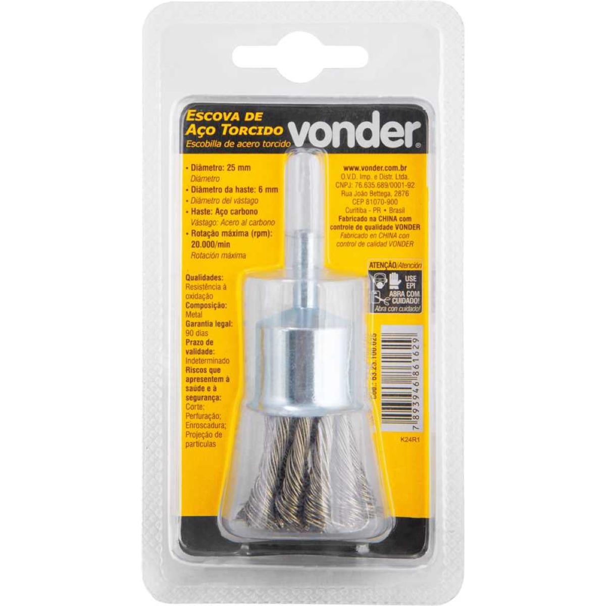 Escova Pincel de Aço Inox Vonder: Limpeza Profunda e Durabilidade A Escova Pincel de Aço Inox Vonder, com 25mm de diâmetro e haste de 6mm, é a solução ideal para quem busca eficiência e resistência em limpezas pesadas. Projetada para uso em furadeiras e retificadeiras, esta escova atinge impressionantes 20.000 RPM, removendo sujeiras incrustadas e ferrugem com facilidade. Suas cerdas em aço inoxidável garantem alta resistência à oxidação, prolongando a vida útil da ferramenta e assegurando um desempenho consistente ao longo do tempo. Com apenas 70 gramas, oferece manuseio confortável e preciso, tornando o trabalho menos cansativo. Perfeita para oficinas, garagens, indústrias e uso doméstico, esta escova é um investimento inteligente para quem valoriza qualidade e praticidade. Ideal para limpeza de metais, remoção de tinta, preparação de superfícies e muito mais. Especificações Material das cerdas: Aço inoxidável Diâmetro: 25 mm Diâmetro do fio: 0,30 mm Diâmetro da haste: 6 mm Rotação máxima: 20.000 RPM Massa aproximada: 0,070 kg Itens Inclusos 1 Escova pincel de aço inox Vonder Perguntas Frequentes (FAQ) Pergunta: Qual o material das cerdas?Resposta: As cerdas são fabricadas em aço inoxidável, proporcionando alta resistência à oxidação. Pergunta: Qual a rotação máxima suportada pela escova?Resposta: A rotação máxima suportada é de 20.000 RPM. Pergunta: A escova serve para qual tipo de ferramenta?Resposta: É indicada para uso em furadeiras e retificadeiras. Pergunta: Qual a garantia do produto?Resposta: Garantia legal: 90 dias.
