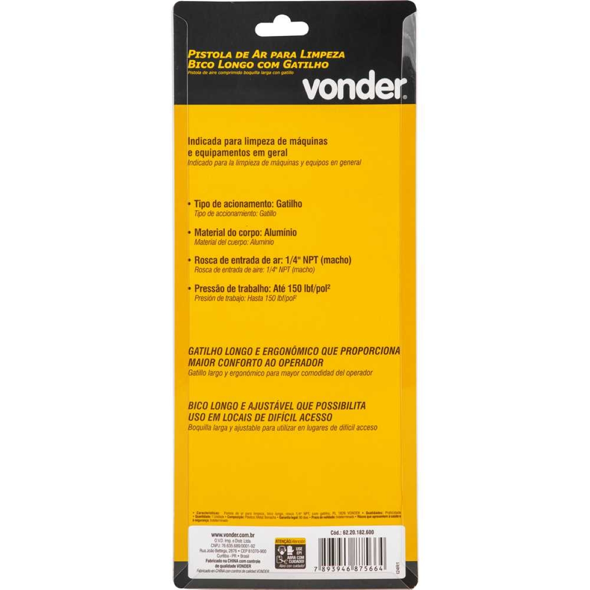 Pistola de Ar para Limpeza com Bico Longo Ajustável – Vonder PL1826 Mantenha suas máquinas e equipamentos impecáveis com a Pistola de Ar para Limpeza Vonder PL1826. Projetada para oferecer conforto e eficiência, esta pistola de ar possui um gatilho longo e ergonômico, reduzindo a fadiga durante o uso prolongado. Seu bico longo, fabricado em aço inox com conexões em latão, é ajustável entre 18 e 26 centímetros, permitindo alcançar áreas de difícil acesso com precisão. Ideal para oficinas, indústrias e manutenção em geral, a PL1826 garante uma limpeza eficaz e profissional. Com rosca de entrada de ar de 1/4" NPT (macho) e pressão de trabalho de até 150 lbf/pol², esta pistola de ar é compatível com a maioria dos compressores. Invista em qualidade e praticidade para otimizar seus processos de limpeza e prolongar a vida útil de seus equipamentos. Especificações Tipo de acionamento: Gatilho Material do corpo: Poliacetal Rosca de entrada de ar: 1/4" NPT (macho) Pressão de trabalho: Até 150 lbf/pol² Massa aproximada: 0,225 kg Itens Inclusos 1 Pistola de Ar para Limpeza Vonder PL1826 Perguntas Frequentes (FAQ) Pergunta: Qual o material do bico da pistola?Resposta: O bico da pistola é fabricado em aço inox, garantindo durabilidade e resistência à corrosão. Pergunta: A pistola é compatível com qual tipo de compressor?Resposta: A pistola possui rosca de entrada de ar de 1/4" NPT (macho), compatível com a maioria dos compressores disponíveis no mercado. Pergunta: Qual a garantia do produto?Resposta: Garantia legal: 90 dias.