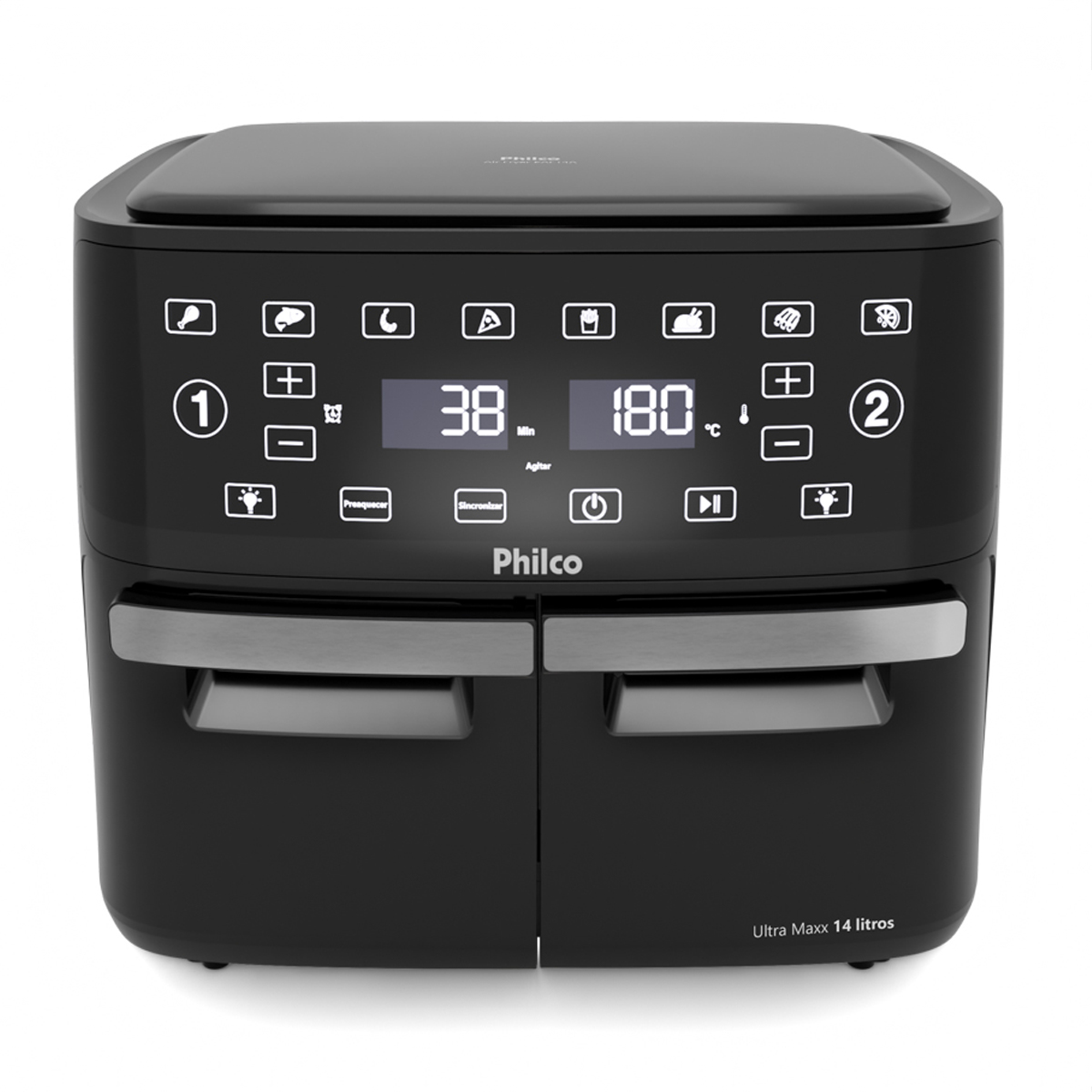 Fritadeira Air Fryer Philco PAF14A 14L: Prepare Refeições Saudáveis e Deliciosas com Facilidade Transforme sua cozinha com a Air Fryer Philco PAF14A, a solução 4 em 1 que assa, frita, desidrata e reaquece seus alimentos de forma prática e saudável. Com sua generosa capacidade de 14 litros, você pode preparar refeições completas para toda a família, desde batatas fritas crocantes até bolos macios e saborosos. O painel digital intuitivo oferece 8 funções pré-programadas, simplificando o preparo e garantindo resultados perfeitos com apenas um toque. A tecnologia Smart Control permite ajustar a temperatura individualmente em cada lado, enquanto a função de sincronização assegura que ambos os lados sejam preparados com o mesmo ajuste. O visor Glass permite acompanhar o cozimento em tempo real, e o controle de temperatura ajustável, de 40 a 200 graus, garante a precisão ideal para cada receita. Desfrute de alimentos mais saudáveis, com até 80% menos gordura, sem abrir mão do sabor e da crocância. A Air Fryer Philco PAF14A é a escolha ideal para quem busca praticidade, versatilidade e uma alimentação mais equilibrada. Especificações Potência: 2000W Capacidade: 14L (total sem divisor) / 3,5L (cesto) Controle de Temperatura: 40 a 200°C Funções: 8 pré-programadas (assar, fritar, desidratar, reaquecer) Tipo de Controle: Digital Material: Metal, plástico e vidro Itens Inclusos Air Fryer Philco PAF14A 14L 3 Grelhas 1 Cesto antiaderente com 3,5L e alça removível Bandeja coletora de gordura e migalhas Divisor de lados Perguntas Frequentes (FAQ) Pergunta: Qual a voltagem da Air Fryer Philco PAF14A?Resposta: Este modelo é 127V. Pergunta: A Air Fryer Philco PAF14A possui timer?Resposta: Sim, possui timer de 60 minutos. Pergunta: É possível fritar sem óleo na Air Fryer Philco PAF14A?Resposta: Sim, a Air Fryer permite fritar com pouquíssimo ou sem óleo, proporcionando alimentos mais saudáveis. Pergunta: A Air Fryer possui algum sistema de segurança?Resposta: Sim, ela possui sistema de proteção contra superaquecimento e base antiderrapante.