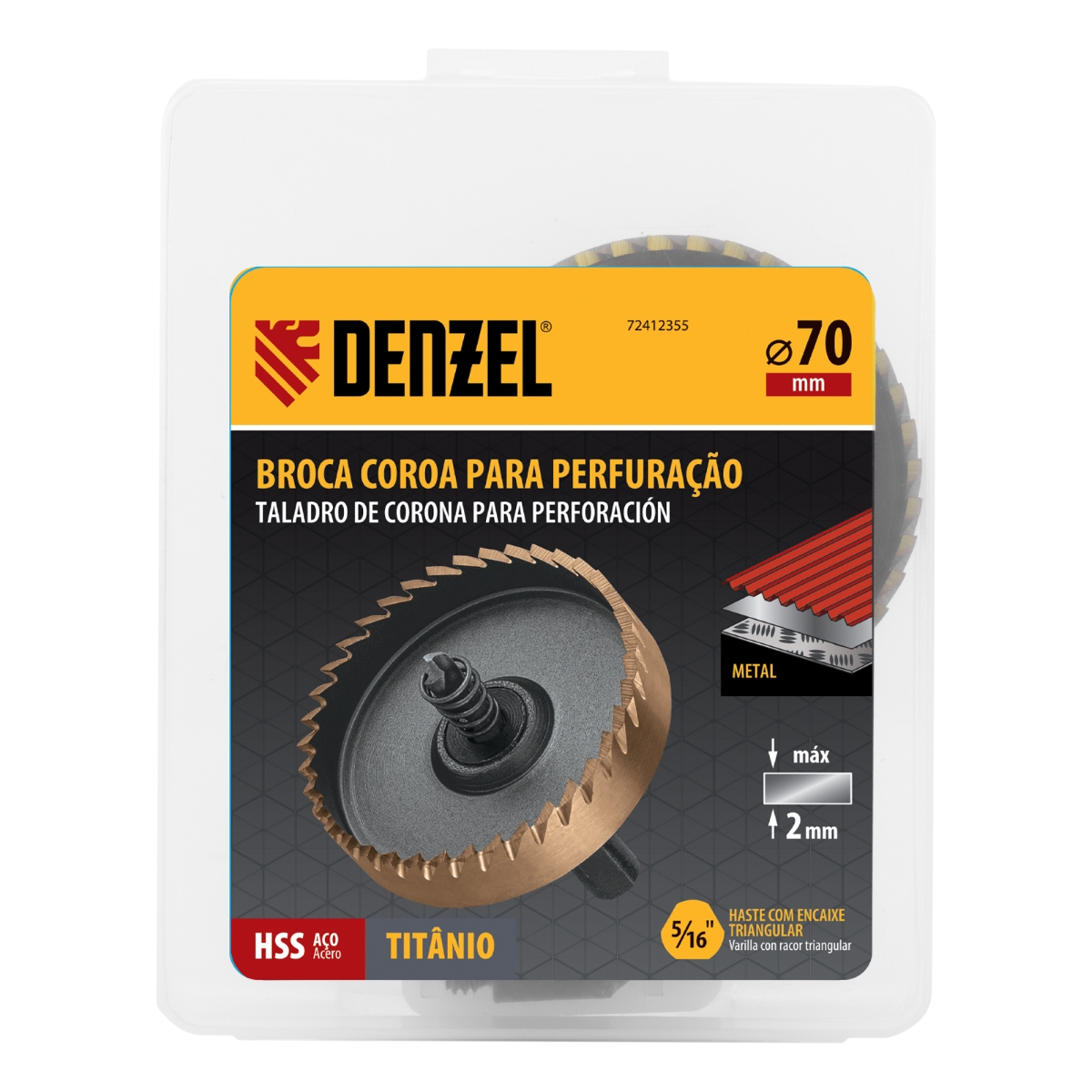 Serra Copo para Metal 70mm com Revestimento de Nitreto de Titânio – Denzel A Serra Copo Denzel 72412355 de 70mm é a solução profissional para quem exige precisão e durabilidade em perfurações. Ideal para metais, plásticos e outros materiais, esta serra copo é perfeita para instalações em canteiros de obras, montagem de equipamentos, fixadores e estruturas diversas. Fabricada em aço HSS de alta qualidade e com revestimento de nitreto de titânio, garante resistência à corrosão e maior vida útil. A broca centralizadora de aço rápido assegura perfurações rápidas e precisas, enquanto a mola especial impede o acúmulo de resíduos, mantendo o local de trabalho limpo. A haste triangular evita rotações indesejadas no mandril, proporcionando estabilidade e controle total durante o uso. Invista na Serra Copo Denzel e eleve a qualidade e eficiência dos seus projetos de perfuração! Especificações Conexão da coroa: M10x1.5 Material de usinagem: Metal, Plástico Profundidade máxima de perfuração: 14 mm País de fabricação: China Altura na embalagem: 130 mm Comprimento na embalagem: 110 mm Peso bruto: 0.3 kg Largura na embalagem: 23 mm Itens Inclusos Serra Copo para Metal 70mm Denzel Perguntas Frequentes (FAQ) Pergunta: Qual o material da serra copo?Resposta: A serra copo é fabricada em aço HSS com revestimento de nitreto de titânio. Pergunta: Para quais materiais esta serra copo é indicada?Resposta: É indicada para perfurar metais pretos, coloridos, plásticos e outros materiais. Pergunta: Qual o diâmetro da serra copo?Resposta: O diâmetro da serra copo é de 70mm. Pergunta: Qual a garantia do produto?Resposta: Garantia legal: 90 dias