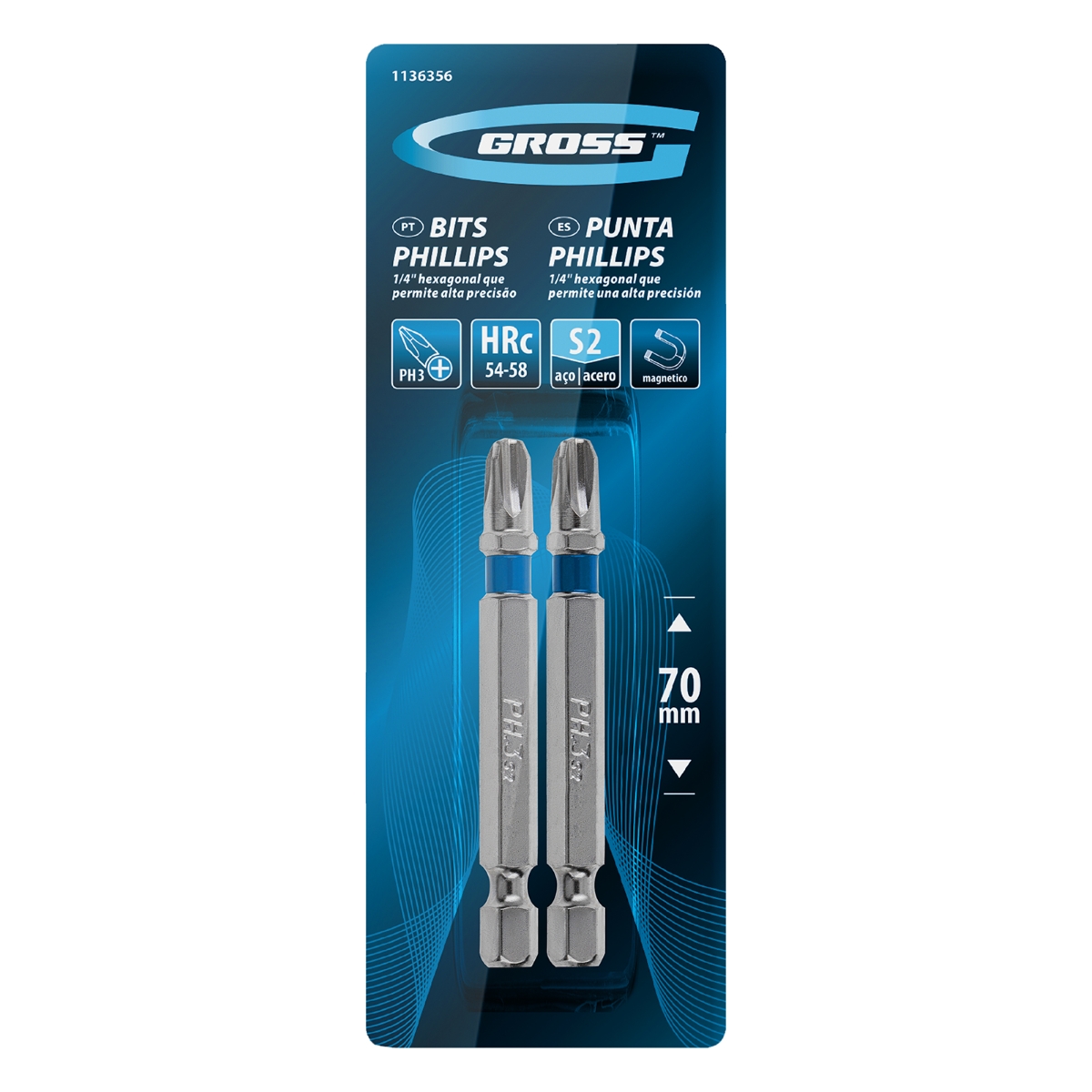 Bits Phillips Gross PH3 x 70mm 2PCS Aço Liga S2 1/4'' Alta Resistência