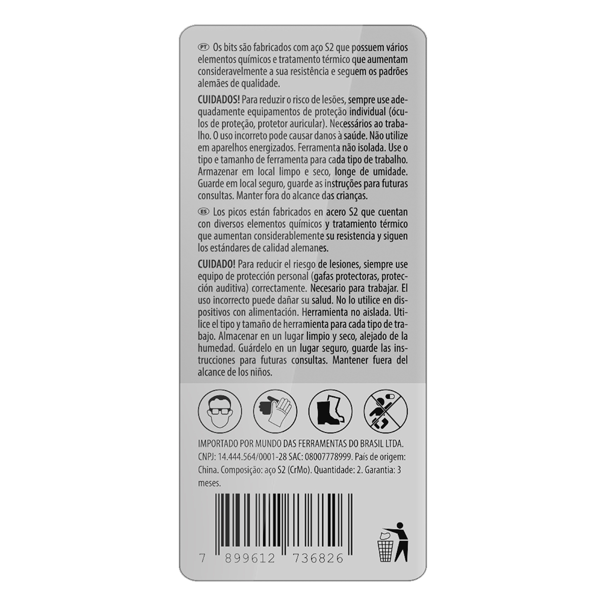 Bits Gross PZ2 x 50mm Aço Japonês S2 - Kit com 2 Unidades para Parafusadeiras Eleve a precisão e a eficiência do seu trabalho com os Bits Gross PZ2 x 50mm. Projetados para oferecer desempenho superior em uma variedade de aplicações, estes bits são a escolha ideal para profissionais e entusiastas do faça-você-mesmo. Fabricados com aço japonês de liga S2, eles garantem alta resistência ao desgaste e deformação, mantendo sua forma e eficácia mesmo sob uso intenso. A compatibilidade com mandris de parafusadeiras, chaves de fenda elétricas e suportes de chave de fenda os torna incrivelmente versáteis, perfeitos para trabalhos em madeira, reparos domésticos e muito mais. O acabamento cromado oferece proteção contra a corrosão, prolongando a vida útil dos bits, enquanto as ranhuras magnéticas garantem uma fixação segura dos parafusos, facilitando o manuseio e aumentando a segurança. A embalagem blister dupla protege os bits e permite uma inspeção detalhada antes da compra, assegurando a qualidade e adequação para suas necessidades. Invista em ferramentas que combinam durabilidade, eficiência e versatilidade – escolha os Bits Gross PZ2 x 50mm e experimente a diferença. Especificações Material: Aço Japonês de liga S2 Dureza: 58 HRC Acabamento: Cromado Tipo de Ponta: PZ2 Comprimento: 50mm Ranhuras: Magnéticas Itens Inclusos 2 Bits Gross PZ2 x 50mm Perguntas Frequentes (FAQ) Pergunta: Qual a durabilidade destes bits? Resposta: Fabricados com aço japonês de liga S2 e com dureza de 58 HRC, estes bits são altamente resistentes ao desgaste e deformação, garantindo uma longa vida útil. Pergunta: São compatíveis com todas as parafusadeiras? Resposta: Sim, são compatíveis com a maioria das parafusadeiras, chaves de fenda elétricas e suportes de chave de fenda que utilizam mandris padrão. Pergunta: O revestimento cromado protege contra ferrugem? Resposta: Sim, o acabamento cromado oferece uma camada de proteção eficaz contra a corrosão, prolongando a vida útil dos bits. Pergunta: Qual a garantia deste produto?Resposta: Garantia legal: 90 dias.