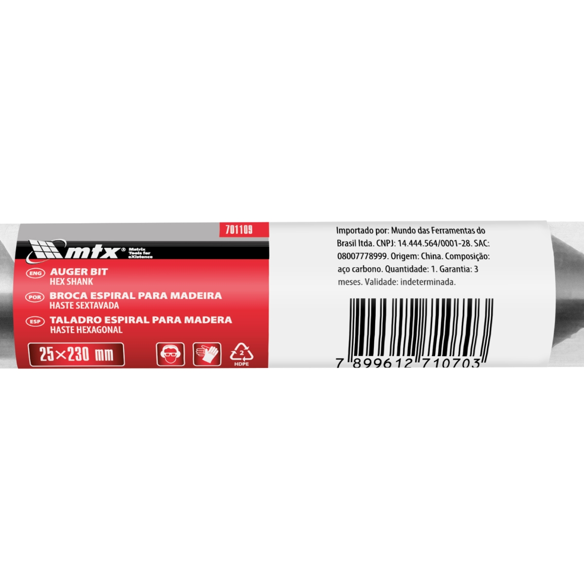 Broca Espiral Madeira 25x230mm Haste Sextavada 1PC Aço 45 MTX 701109