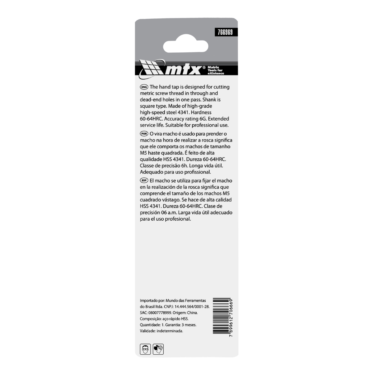 Crie Roscas Perfeitas com o Macho Manual MTX M12 x 1.75mm O Macho Manual MTX 766969 em Aço HSS é a ferramenta ideal para quem busca precisão e eficiência na criação de roscas internas. Projetado para diâmetro M12 e passo de 1,75mm, este macho manual garante cortes limpos e precisos em peças de aço com resistência de até 900 N/mm², mesmo em uma única passagem. Sua compatibilidade com suportes de macho com mandril de cauda de 7mm o torna versátil para uso em oficinas mecânicas e projetos DIY. Fabricado em aço rápido P6M5 com dureza de 60-64 HRC, oferece resistência excepcional e durabilidade prolongada, mantendo a afiação por mais tempo. A embalagem blister transparente protege a ferramenta e permite fácil inspeção antes da compra. Invista em qualidade e obtenha resultados profissionais em seus projetos de rosqueamento com o Macho Manual MTX. Especificações Classe de Precisão: 4H Direção da Rosca: Direita País de Fabricação: China Diâmetro da Rosca (M): M12 Passo da Rosca: 1.75 mm Material: Aço HSS P6M5 Dureza: 60-64 HRC Itens Inclusos Macho Manual MTX M12 x 1.75mm Perguntas Frequentes (FAQ) Pergunta: Qual o material do macho manual?Resposta: O macho manual MTX é fabricado em Aço HSS P6M5, garantindo alta resistência e durabilidade. Pergunta: Para quais materiais este macho é adequado?Resposta: Este macho é ideal para peças de aço com resistência de até 900 N/mm². Pergunta: Qual o diâmetro e passo da rosca que este macho cria?Resposta: Este macho cria roscas internas com diâmetro M12 e passo de 1,75 mm. Pergunta: Este macho serve para furos cegos e passantes?Resposta: Sim, o macho manual MTX é versátil e pode ser utilizado tanto em furos cegos quanto passantes. Pergunta: Qual a garantia do produto?Resposta: Garantia legal: 90 dias
