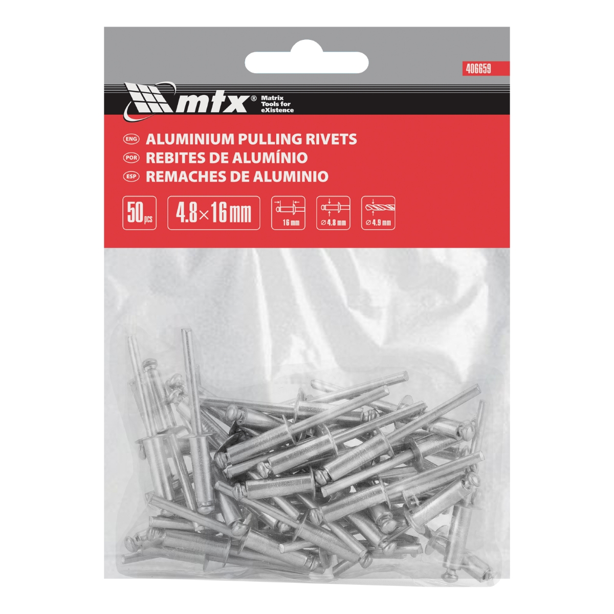 Rebite de Repuxo 4,8 x 16mm 50 Unidades MTX Aço Galvanizado Resistente à Corrosão