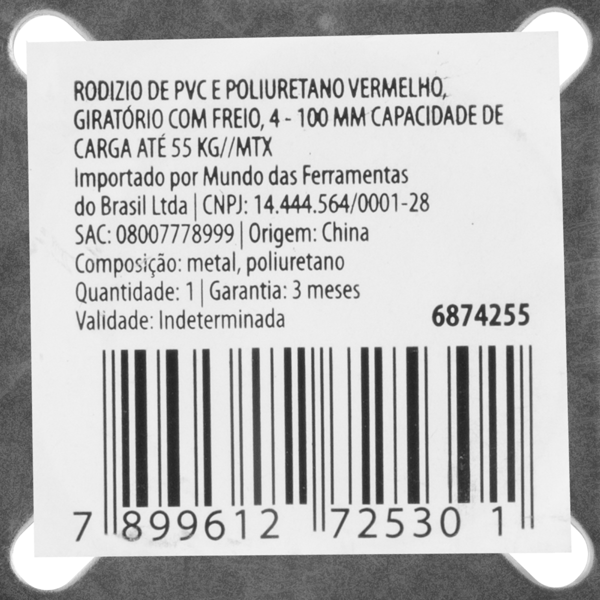 Rodízio Robusto com Freio: Segurança e Durabilidade para suas Cargas O rodízio fixo com freio de 100mm da MTX é a solução ideal para quem busca segurança e eficiência no transporte de cargas moderadas. Fabricado com borracha vermelha de poliuretano (PVC PU) de alta qualidade, este rodízio oferece resistência superior ao desgaste, garantindo uma longa vida útil mesmo em ambientes exigentes. Sua capacidade de suportar até 50kg o torna perfeito para carrinhos industriais, móveis, equipamentos e suportes fixos que necessitam de estabilidade e imobilização segura. Diferente dos rodízios giratórios, o modelo fixo proporciona um deslocamento linear, ideal para trajetos retilíneos e evitando manobras desnecessárias. O sistema de freio integrado garante a imobilização completa, prevenindo acidentes em superfícies inclinadas ou quando o equipamento precisa permanecer estático. Com design robusto e materiais selecionados, este rodízio MTX combina durabilidade, desempenho e segurança para uso doméstico, comercial e industrial leve. Especificações País de Fabricação: China Diâmetro: 100 mm Capacidade de Carga: 50 kg Material do Revestimento: Borracha de Poliuretano (PVC PU) Tipo: Fixo com Freio Itens Inclusos 1 Rodízio Fixo com Freio MTX 100mm Perguntas Frequentes (FAQ) Pergunta: Qual a capacidade de carga deste rodízio?Resposta: Este rodízio suporta uma carga de até 50 kg. Pergunta: Qual o material do revestimento do rodízio?Resposta: O revestimento é feito de borracha de poliuretano (PVC PU), que oferece alta resistência ao desgaste e proteção contra riscos em pisos. Pergunta: Este rodízio é adequado para carrinhos industriais?Resposta: Sim, ele é ideal para carrinhos industriais, móveis e suportes fixos que necessitam de estabilidade e segurança. Pergunta: Qual a garantia do produto?Resposta: Garantia legal: 90 dias