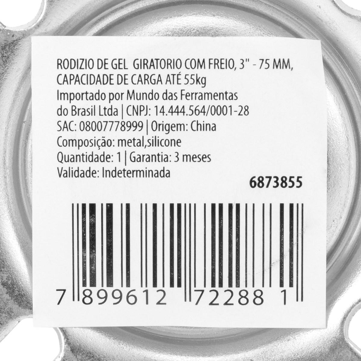 Rodízio Gel Giratório com Freio 3 Pol 75mm 55kg 1PC MTX - Durável e Silencioso