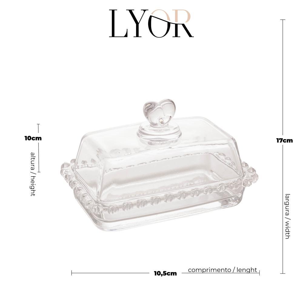 A Manteigueira de Cristal com Tampa Coração da Lyor é muito mais do que um simples recipiente, é uma peça de elegância e sofisticação para a sua mesa. Com dimensões de 17cm x 10,5cm x 10cm, esta manteigueira é perfeita para manter a manteiga sempre fresca e pronta para ser servida com estilo. O design elegante e delicado com um belo coração na tampa adiciona um toque romântico à sua decoração.Características:- Material de Alta Qualidade: Feita em cristal de alta qualidade, esta manteigueira é resistente e durável, garantindo sua longa vida útil.- Fácil de Limpar: Para manter a beleza desta peça, basta lavar com detergente neutro, esponja macia e secar imediatamente. Evite lavar em máquinas e utilizar produtos químicos agressivos para preservar sua elegância.- Design Funcional: Além de ser um item decorativo, a manteigueira com tampa coração é prática e funcional, mantendo a manteiga protegida e pronta para ser usada a qualquer momento.A Manteigueira de Cristal com Tampa Coração da Lyor é a escolha perfeita para quem busca aliar beleza, qualidade e praticidade em um único produto. Adicione charme e requinte à sua mesa com esta peça encantadora e surpreenda seus convidados com um toque de sofisticação em cada detalhe.Encante em cada detalhe com a Manteigueira de Cristal com Tampa Coração da Lyor. Feita em cristal de alta qualidade, é prática, resistente e elegante. Adicione sofisticação à sua mesa e mantenha a manteiga fresca. Ideal para quem valoriza beleza, qualidade e funcionalidade.