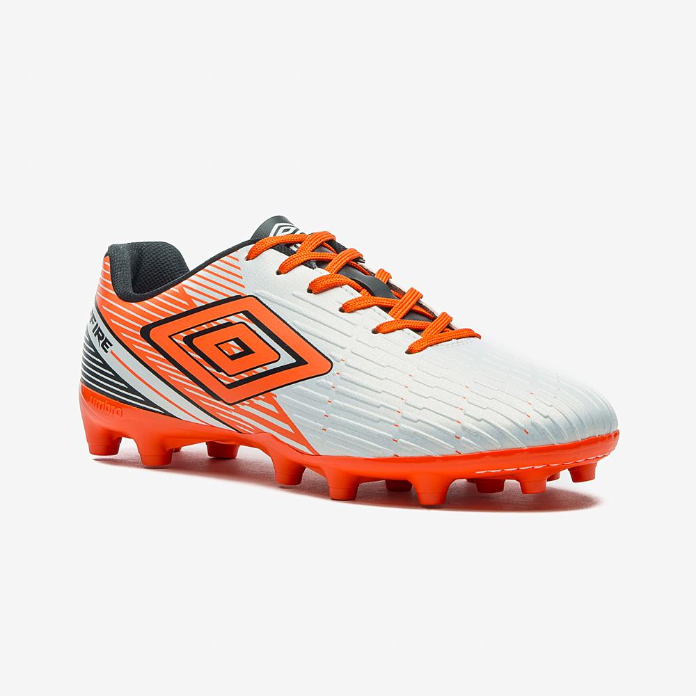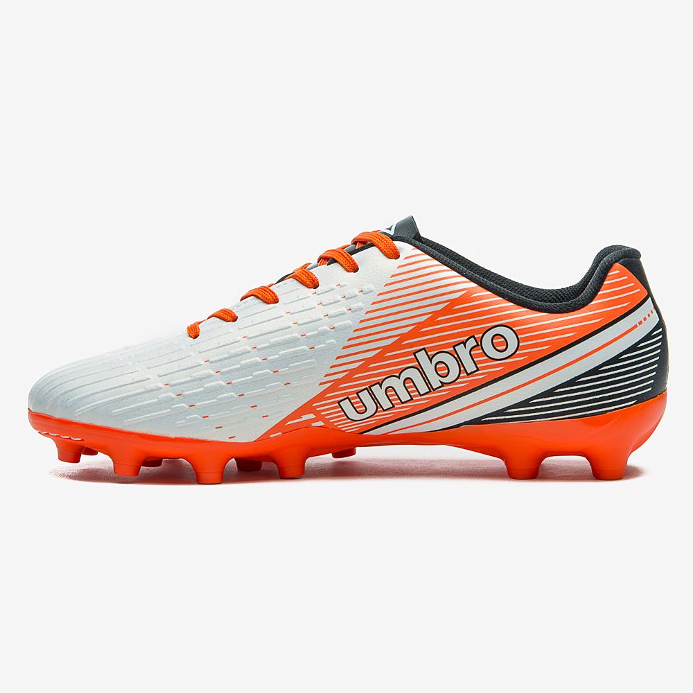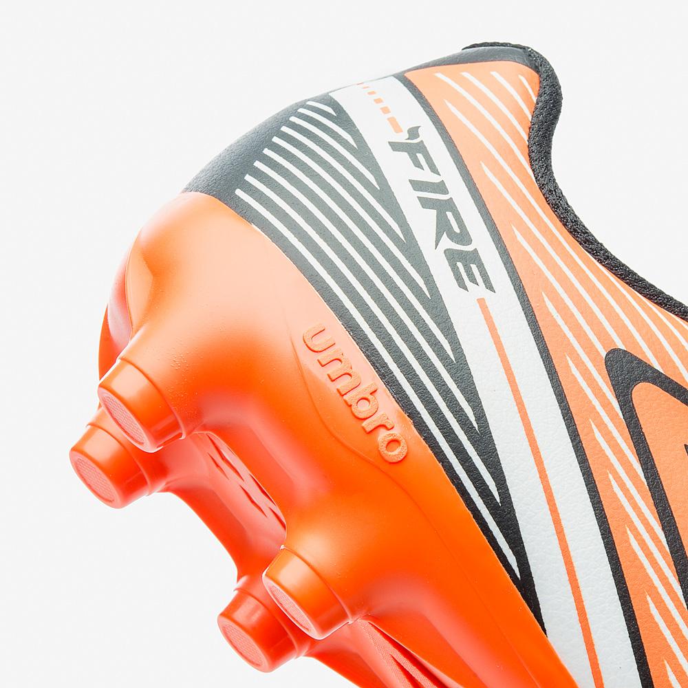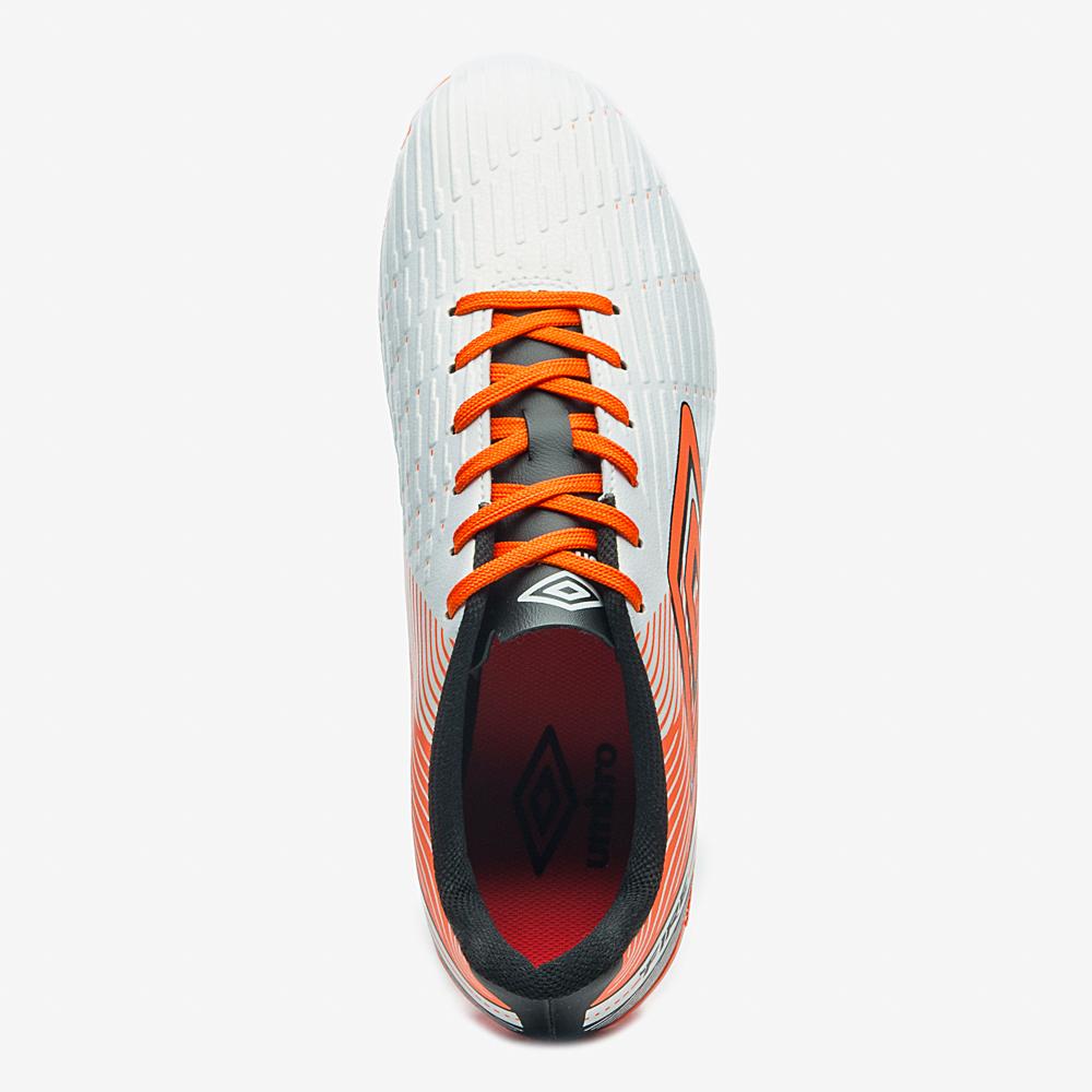 Indicada para jogadores iniciantes, a Chuteira Campo Umbro Fire exibe um visual marcante com bloco de cores contrastantes e arte assimétrica personalizada com efeito gráfico de layers em listras sobrepostas. A textura frontal aplicada no cabedal oferece grip para otimizar o controle direcional da bola no momento do chute, além de oferecer um design diferenciado e moderno.Cabedal (parte superior do calçado) frequenciado construído em material laminado com forro em poliéster. Possui aplique de alta frequência posicionada na parte frontal, maxi Diamante Umbro na lateral externa em destaque com assinatura do modelo ao lado e palmilha interna em EVA forrado com tecido para proporcionar maciez. O solado de campo FG de 14 travas segue um design minimalista, produzido em PVC, que oferece durabilidade e aderência.