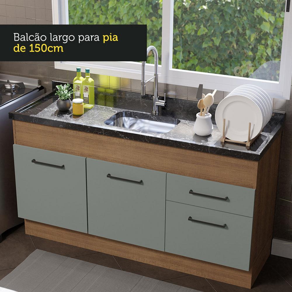 O Balcão de Pia de 150 cm da linha Agata da Madesa é ideal para quem quer otimizar o espaço da sua cozinha.Desenvolvido com materiais de alta qualidade, possui puxadores com alça em alumínio e dobradiças com amortecimento, que proporcionam um fechamento suave para as duas portas.Já as duas gavetas contam com corrediças telescópicas, que permitem sua total abertura. Por seu ótimo tamanho, o balcão permite acomodar de maneira organizada: panelas, utensílios, louças, talheres e muito mais.O espaço para a colocação de tampo ou pia é de 150 cm de largura x 52 cm de profundidade.O acabamento da estrutura é em amadeirado Rustic e o das portas e frentes das gavetas é cinza. É feito em Pintura Poliéster com sete camadas, um método ecológico e que protege o móvel dos efeitos da água e do calor.A linha de cozinhas Agata é totalmente modulada. É possível combinar este balcão com outros módulos e com todas as cozinhas disponíveis na linha.Medidas totais:- 81 cm de altura- 150 cm de largura- 52 cm de profundidadeItens inclusos:- Um (1) Balcão com duas (2) portas e duas (2) gavetas (Não acompanha tampo.)Código do produto: G24153F9AGObs.:- Imagens meramente ilustrativas- A pia, a torneira e a decoração não acompanham o produto- A Madesa não disponibiliza serviço de montagem- O produto segue com manual e todas as ferragens necessárias para a instalação1 – O produto é novo ou usado?R.: Todos os produtos da Madesa são novos, enviados da nossa fábrica diretamente para as casas de nossos clientes.2 – O produto vem montado? Se não, vocês realizam a montagem?R.: A Madesa não disponibiliza serviço de montagem. Todos os produtos seguem com manual de instalação e as ferragens necessárias. Alguns produtos possuem vídeo explicando o passo a passo da montagem.3 – Vocês possuem loja física? Posso retirar meu produto em mãos?R.: Não possuímos loja física, apenas loja virtual. Confira as opções de envio ao colocar o seu CEP.4 – Qual é o valor do envio? Posso pagar separadamente?R.: O valor do envio é calculado com base no peso e volume do produto, e no CEP de destino. Você pode calcular o valor e prazo de entrega no simulador.5 – A Madesa entrega em todo Brasil? Como é feita a entrega?R.: Sim, entregamos no Brasil inteiro através de transportadoras parceiras.6 – O produto acompanha Nota Fiscal?R.: Sim, todos os produtos são entregues com suas respectivas notas fiscais.7 – Os produtos possuem garantia?R.: Sim. A Madesa oferece 3 meses de garantia para defeitos de fabricação.A Madesa se dedica à sustentabilidade com várias iniciativas: temos uma usina própria para gerar energia que abastece uma de nossas fábricas. Selecionamos nossos fornecedores, priorizando aqueles que possuem um compromisso com a sustentabilidade e proteção do meio ambiente. Todo o plástico utilizado no setor produtivo é proveniente de reciclagem e as suas sobras são encaminhadas ao fornecedor que os recicla. Também investimos no desenvolvimento contínuo de nossos colaboradores e em ações educacionais que beneficiem a comunidade.