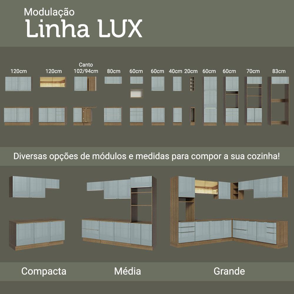 Este Armário de Cozinha Completa de Canto da linha Lux da Madesa é espaçoso e funcional, ideal para ambientes grandes. É uma cozinha planejada, já que possui módulos que podem ser organizados conforme a sua necessidade.Fabricado com componentes de alta qualidade, possui puxadores em alumínio, corrediças telescópicas e dobradiças com amortecedores para o fechamento suave das portas, além de revestimento metálico nas portas e gavetas.Um dos principais diferenciais desta versão são as portas e gavetas, que recebem um vidro cinza aplicado, detalhe que traz muita elegância ao ambiente.Super espaçosa, a cozinha conta com espaço para organizar tudo o que você precisa. Além disso, todos os balcões acompanham tampo e possuem pés em PVC, com regulagem de altura e rodapé removível.O acabamento da estrutura é em amadeirado Rustic e o das portas e frentes é cinza. É feito em Pintura Poliéster, com sete camadas que protegem o móvel dos efeitos do álcool da água e do calor.Medidas totais:- 225 cm de altura- 546 cm de largura- 60 cm nos módulos inferiores e 31 cm nos aéreosItens inclusos:- Um (1) Paneleiro de 60 cm com três (3) portas- Uma (1) Torre Quente de 60 cm com uma (1) porta, três (3) gavetas e dois (2) nichos- Um (1) Aéreo de 60 cm com uma (1) porta- Um (1) Balcão de 60 cm com três (3) gavetas- Um (1) Aéreo de 120 cm com duas (2) portas- Um (1) Balcão de pia de 120 cm com duas (2) portas- Um (1) Aéreo de canto com uma (1) porta basculante e adega acoplada- Um (1) Balcão de canto com uma (1) porta- Um (1) Aéreo de 80 cm com uma (1) porta basculante- Um (1) Balcão de 80 cm com duas (2) gavetas grandesCódigo do produto: GCLX5460059NObs.:- Imagens meramente ilustrativas, os eletros, o tampo da pia, a torneira e a decoração não acompanham o produto- A Madesa não disponibiliza serviço de montagem- O produto segue com manual e todas as ferragens necessárias para a instalação- É necessário fixar o paneleiro e a torre quente na parede1 – O produto vem montado? Se não, vocês realizam a montagem?R.: A Madesa não disponibiliza serviço de montagem. Todos os produtos seguem com manual de instalação e as ferragens necessárias. Alguns produtos possuem vídeo explicando o passo a passo da montagem.2 – Vocês possuem loja física? Posso retirar meu produto em mãos?R.: Não possuímos loja física, apenas loja virtual. Confira as opções de envio ao colocar o seu CEP.3 – Qual é o valor do envio? Posso pagar separadamente?R.: O valor do envio é calculado com base no peso e volume do produto, e no CEP de destino. Você pode calcular o valor e prazo de entrega no simulador.4 – A Madesa entrega em todo Brasil? Como é feita a entrega?R.: Sim, entregamos no Brasil inteiro através de transportadoras parceiras.5 – Os produtos possuem garantia?R.: Sim. A Madesa oferece 3 meses de garantia para defeitos de fabricação.A Madesa se dedica à sustentabilidade com várias iniciativas: temos uma usina própria para gerar energia que abastece uma de nossas fábricas. Selecionamos nossos fornecedores, priorizando aqueles que possuem um compromisso com a sustentabilidade e proteção do meio ambiente. Todo o plástico utilizado no setor produtivo é proveniente de reciclagem e as suas sobras são encaminhadas ao fornecedor que os recicla. Também investimos no desenvolvimento contínuo de nossos colaboradores e em ações educacionais que beneficiem a comunidade.