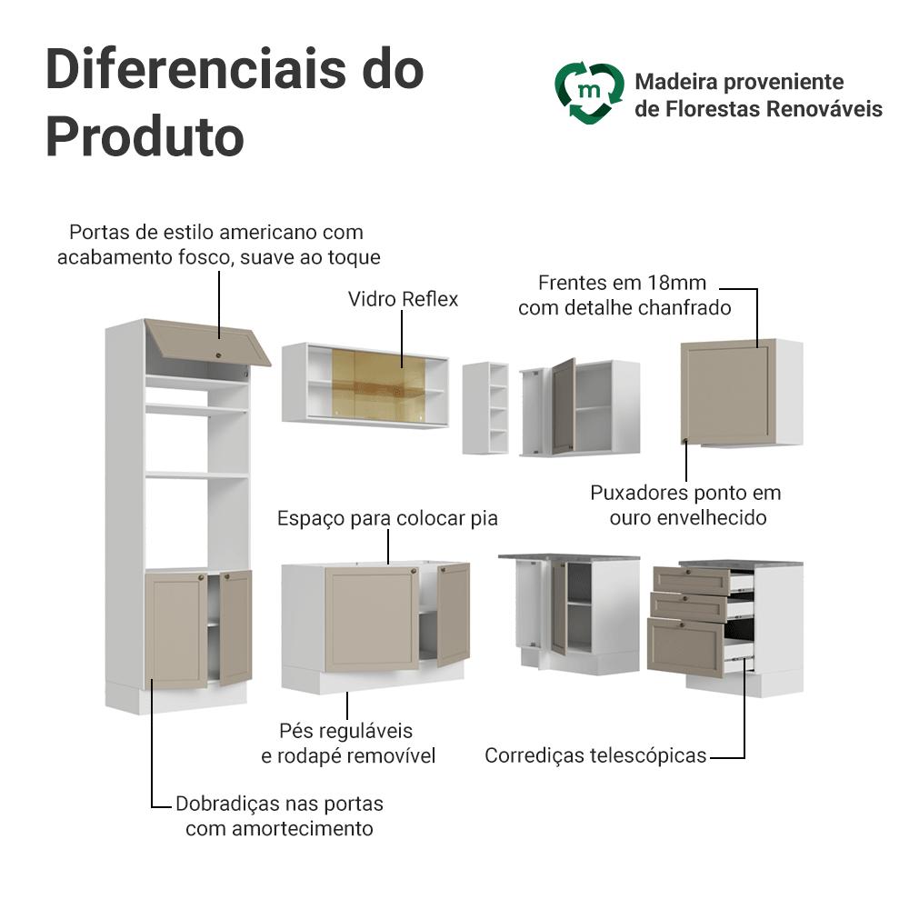 Transforme sua cozinha em um espaço mais funcional com a Linha Vik.O acabamento de alta resistência da estrutura é branco e das frentes no tom crema. O destaque fica por conta dos puxadores ponto e no detalhe das frentes, que forma molduras elegantes.A linha Vik é funcional em cada detalhe, com diferencias para você ter mais praticidade no dia a dia.Medidas:- 225cm de altura- 399cm de largura- 52cm de profundidade no balcões e torre quente e 31cm nos aéreosnformações técnicas:- Material: MDP- Peso total suportado: 420 kg- Altura dos pés: reguláveis de 15cm a 20cmO que você recebe:- Um Balcão de pia de 120 cm com duas portas (Não acompanha o tampo)- Um Balcão de canto com uma porta- Um Balcão de 60 cm com três gavetas- Uma torre quente de 70 cm com três portas e dois nichos- Um Aéreo de 120 cm com duas portas de vidro reflex- Uma Adega com quatro nichos- Um Aéreo de canto com uma porta- Um Aéreo de 60 cm com uma portaCódigo do produto: GCVK3990025LÉ importante saber:- Imagens ilustrativas, a decoração não acompanha o produto.- A Madesa não oferece serviço de montagem.- O produto segue com manual e todas as ferragens necessárias.A Madesa possui compromisso com a sustentabilidade. Geramos energia limpa em nossa própria usina, priorizamos fornecedores responsáveis e utilizamos plástico reciclado em nossa produção. Além disso, reinserimos sobras no ciclo de reciclagem e investimos no desenvolvimento de nossos colaboradores e da comunidade.Garantia: Este produto conta com 1 ano de garantia total, sendo 3 meses de garantia legal e 9 meses de garantia contratual. A garantia cobre exclusivamente defeitos de fabricação e vícios ocultos. Não estão cobertos: problemas decorrentes de montagem incorreta, uso inadequado, exposição à umidade, calor ou luz solar direta, modificações no produto ou desgaste natural.