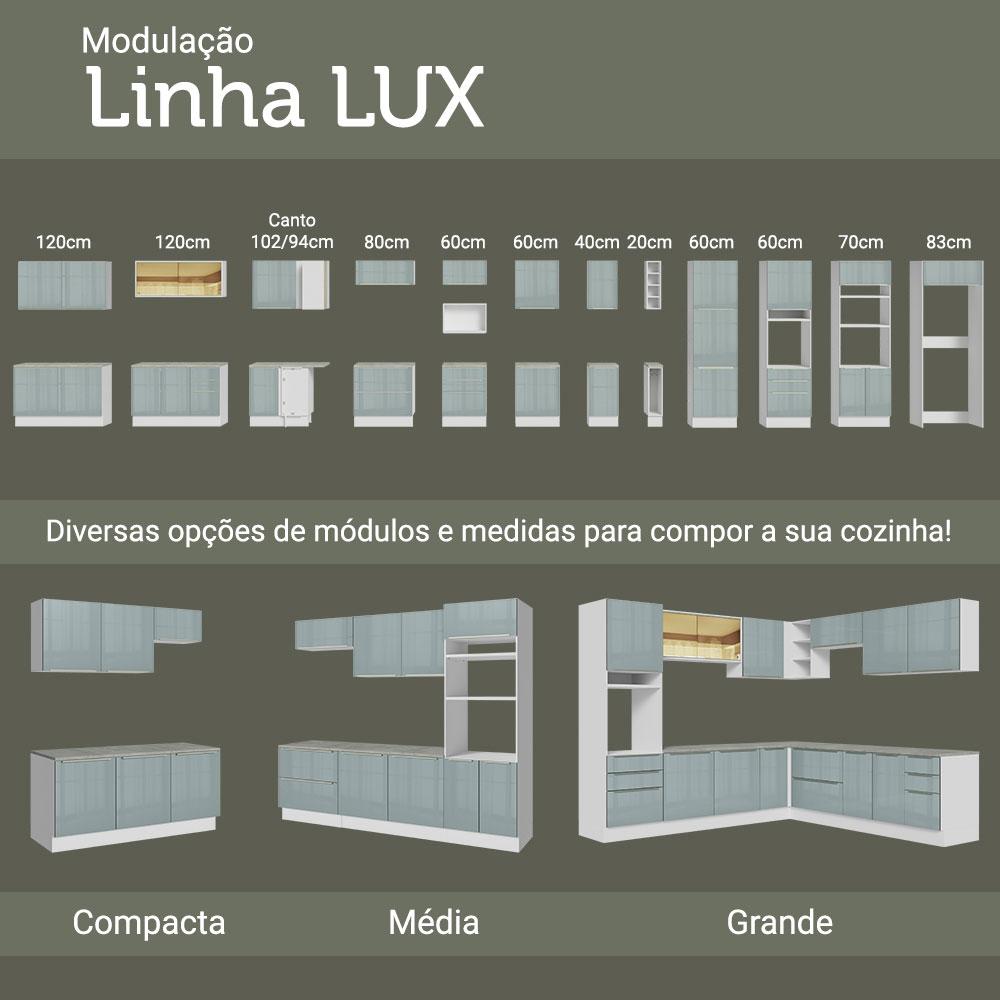 Beleza e sofisticação definem perfeitamente a linha de cozinhas Lux da Madesa.As portas e gavetas, que recebem um vidro cinza aplicado, são o grande destaque e trazem muita elegância ao ambiente.Fabricada com itens de qualidade superior, possui gavetas com corrediças telescópicas, portas com amortecedores para o fechamento suave e puxadores em alumínio, mais resistentes ao uso diário.Um outro detalhe que chama a atenção nesta cozinha é a profundidade maior, como uma cozinha planejada: 60 cm.O balcão de pia comporta pias de inox ou pedra no tamanho de 120 cm x 60 cm e não acompanha tampo. Já o tampo do balcão de 80 cm pode ser recortado para instalação de cooktop.Para oferecer ainda mais espaço, a torre comporta forno ou micro-ondas e permite a instalação de forno embutido.Medidas totais da cozinha:- 225 cm de altura- 320 cm de largura- 60 cm de profundidade no paneleiro, na torre e nos balcões e 31 cm nos aéreosO acabamento da estrutura é branco e o das portas e frentes das gavetas é cinza. É feito em Pintura Poliéster com 7 camadas de proteção resistentes a álcool, água e calor.Itens inclusos:- Uma (1) Torre-quente de 60 cm com uma (1) porta, três (3) gavetas, sendo uma maior e dois (2) nichos, sendo um para forno- Um (1) Aéreo de 120 cm com duas (2) portas de correr- Um (1) Balcão de pia de 120 cm com duas (2) portas (Não acompanha tampo para este balcão)- Um (1) Aéreo de 60 cm com uma (1) porta- Um (1) Balcão de 60 cm de largura com uma (1) porta e tampo- Um (1) Aéreo de 80 cm com uma (1) porta basculante- Um (1) Balcão de 80 cm de largura com duas (2) portas e tampoCódigo do produto: GRLX3200049RObs.:- Imagens meramente ilustrativas, os eletros, o tampo da pia, a torneira e a decoração não acompanham o produto- É obrigatório fixar a torre-quente na parede- A Madesa não disponibiliza serviço de montagem- O produto segue com manual de instalação e todas as ferragens necessárias para sua montagem1 – O produto é novo ou usado?R.: Todos os produtos da Madesa são novos, enviados da nossa fábrica diretamente para as casas de nossos clientes.2 – O produto vem montado? Se não, vocês realizam a montagem?R.: A Madesa não disponibiliza serviço de montagem. Todos os produtos seguem com manual de instalação e as ferragens necessárias. Alguns produtos possuem vídeo explicando o passo a passo da montagem.3 – Vocês possuem loja física? Posso retirar meu produto em mãos?R.: Não possuímos loja física, apenas loja virtual. Confira as opções de envio ao colocar o seu CEP.4 – Qual é o valor do envio? Posso pagar separadamente?R.: O valor do envio é calculado com base no peso e volume do produto, e no CEP de destino. Você pode calcular o valor e prazo de entrega no simulador.5 – A Madesa entrega em todo Brasil? Como é feita a entrega?R.: Sim, entregamos no Brasil inteiro através de transportadoras parceiras.6 – O produto acompanha Nota Fiscal?R.: Sim, todos os produtos são entregues com suas respectivas notas fiscais.7 – Os produtos possuem garantia?R.: Sim. A Madesa oferece 3 meses de garantia para defeitos de fabricação.A Madesa se dedica à sustentabilidade com várias iniciativas: temos uma usina própria para gerar energia que abastece uma de nossas fábricas. Selecionamos nossos fornecedores, priorizando aqueles que possuem um compromisso com a sustentabilidade e proteção do meio ambiente. Todo o plástico utilizado no setor produtivo é proveniente de reciclagem e as suas sobras são encaminhadas ao fornecedor que os recicla. Também investimos no desenvolvimento contínuo de nossos colaboradores e em ações educacionais que beneficiem a comunidade.
