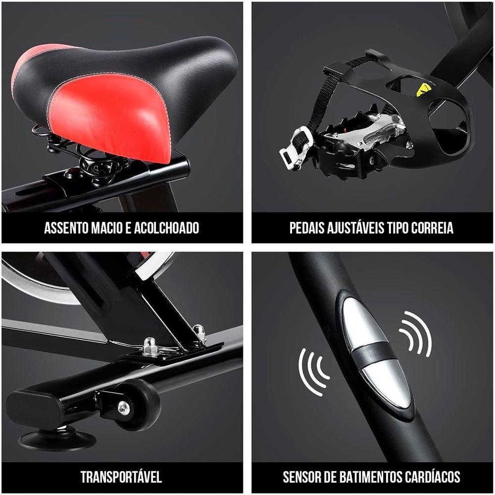 Bicicleta Ergométrica Spinning Ahead Sports Inercia 6kg Fitness Indoor Ate 120kgA Bicicleta Ergométrica Spinning Mecânica Ahead foi desenvolvida para quem busca treinos intensos, confortáveis e seguros no conforto de casa. Ideal para condicionamento físico, queima de calorias e fortalecimento cardiovascular, ela proporciona uma pedalada fluida e estável, simulando a experiência de uma bicicleta de estrada profissional.Com volante de inércia de 6 kg e sistema de transmissão por correia silenciosa, a pedalada se torna mais suave e realista. O ajuste manual de resistência permite personalizar o nível de intensidade, tornando-a perfeita tanto para iniciantes quanto para atletas experientes.Além disso, o assento e guidão ajustáveis garantem ergonomia e conforto, adaptando-se a diferentes alturas e posturas. Sua estrutura em aço reforçado suporta até 120 kg, oferecendo segurança e durabilidade para uso contínuo. O painel digital multifuncional exibe em tempo real informações essenciais como tempo, velocidade e distância, ajudando você a acompanhar seu desempenho e progresso em cada treino.Benefícios Principais- Melhora o condicionamento físico e o desempenho cardiovascular- Ajuda na perda de peso e tonificação muscular- Treinos silenciosos e suaves- Ajuste de resistência para diferentes níveis de intensidade- Conforto e estabilidade com assento e guidão reguláveisEspecificações TécnicasMarca: Ahead SportsModelo: SpinningVolante de inércia: 6 kgPeso máximo do usuário: 120 kgMaterial: Aço ReforçadoTipo de resistência: Mecânica com ajuste manualCor: Preto com detalhes em vermelhoConteúdo da Embalagem1 bicicleta ergométrica1 manual de instalaçãoGarantia3 meses contra defeitos de fabricaçãoImagens meramente ilustrativas