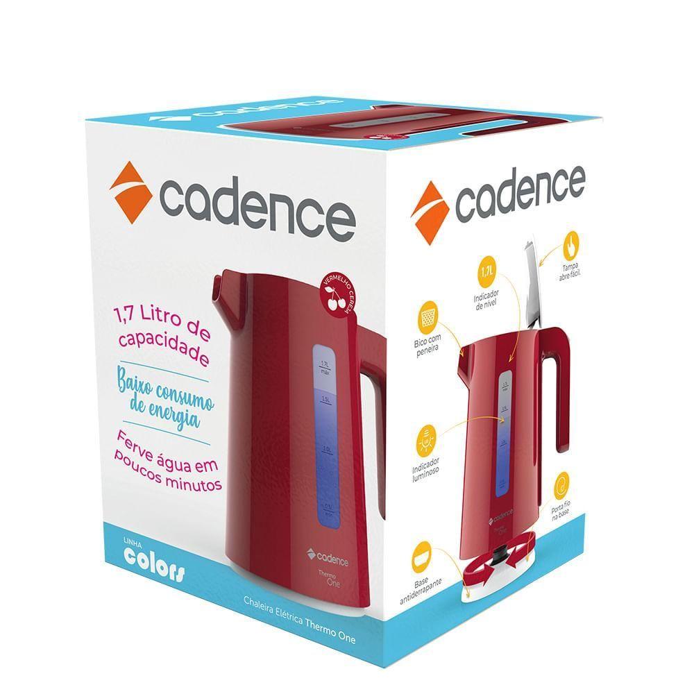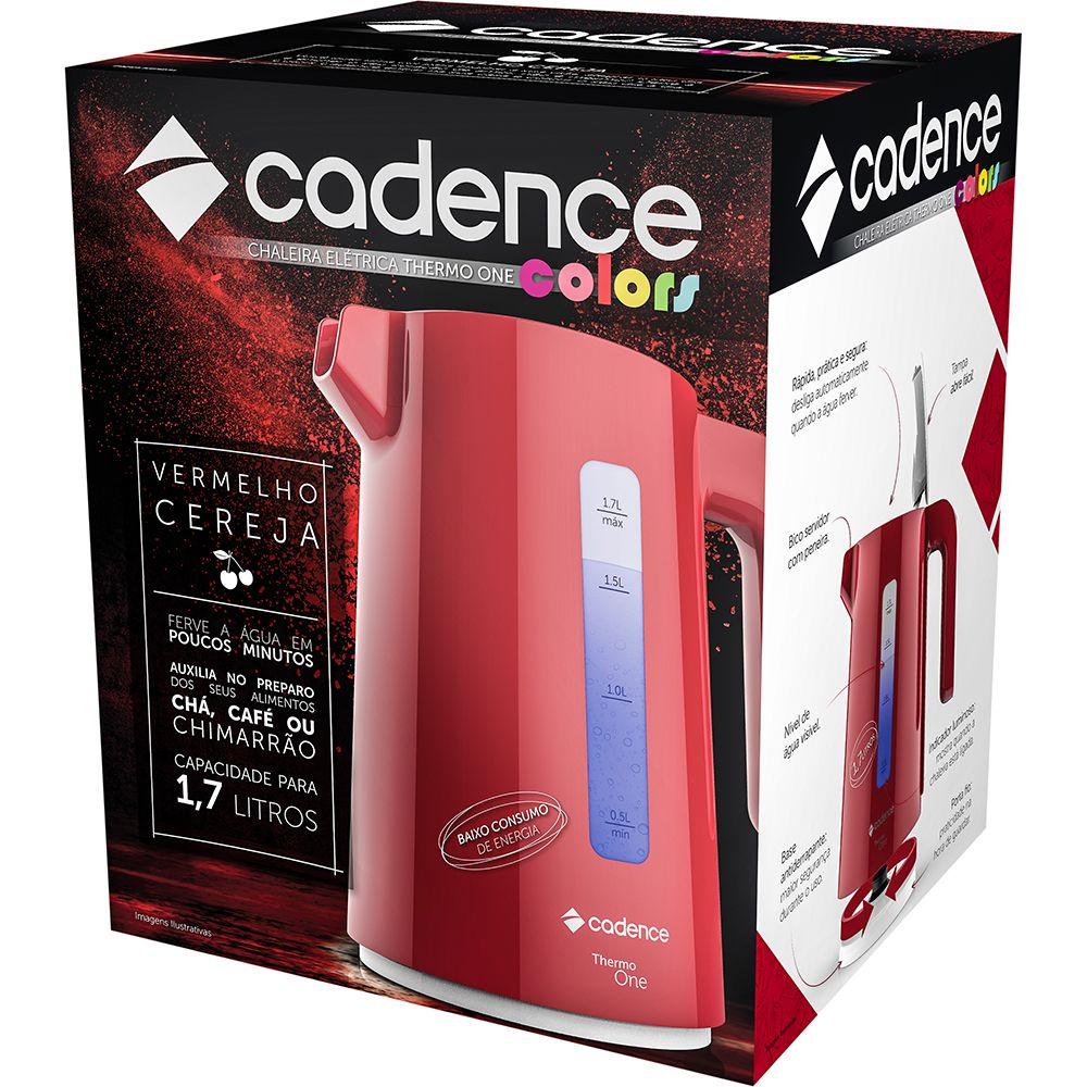 Chaleira Elétrica Cadence Thermo One Colors 1,7l Vermelha - 127v 127vChaleira Elétrica Colors - Sem perder tempo, sem ocupar espaço!-Esquenta água de maneira rápida e prática-Capacidade de 1,7L-Resistência embutida: Mais segurança e higiene-Sistema luminoso que indica processo de fervura-Base antiderrapante-Jarra independente de base: pode ser levada a mesa-Potente e baixo consumo de energiaSelo de Segurança OCP SGSCódigo de barras: 7898615982681 / 7898615982698 | Código da Certificação: SGS | Manual: https://catalog-newellbrands.s3.amazonaws.com/cadence/CEL381/manual/CEL381-manual.zip | Consumo: 1,20kWh / 1,85kWh | Peso Embalagem Indiv. [Kg]: 0,92Kg | Código de Barra [DUN-14]: 1 789861598268-8 / 1 789861598269-5 | Certificações: Inmetro | Fotos HD: https://catalog-newellbrands.s3.amazonaws.com/cadence/CEL381/fotos-hd/CEL381-fotos-hd.zip | Tensão: 127V / 220V | CEST: 21.043.00 | Descrição do Produto: -Design e cores exclusivas Cadence. - Abertura fácil. - Ferve a água em menos de 7min (220v). - Segurança: sistema de proteção contra superaquecimento. | Garantia (meses): 12 | Dimensões [LxAxP]: 210x233x145mm | Peso: 0,72kg | Modelo: CEL381-127 / CEL381-220 | Medidas Embalagem Indiv. [LxAxP]: 190x235x175mm | Classificação Fiscal / NCM: 8516.10.00 | Dados Tecnicos: https://catalog-newellbrands.s3.amazonaws.com/cadence/CEL381/dados-tecnicos/CEL381-ficha-comercial.zip | Midias: https://drive.google.com/drive/u/1/folders/1py-QgKQUwRbHE2SpqrSyR5KyWGYOBJT0 | Qtde. por embalagem Master: 6 | Peso Embalagem Master [Kg]: 6,5kg | Medidas Embalagem Master [LxAxP]: 540x490x200mm | Pagina Produto: https://catalog-newellbrands.s3.amazonaws.com/cadence/CEL381/pdp/CEL381-pdp.zip | HTML: