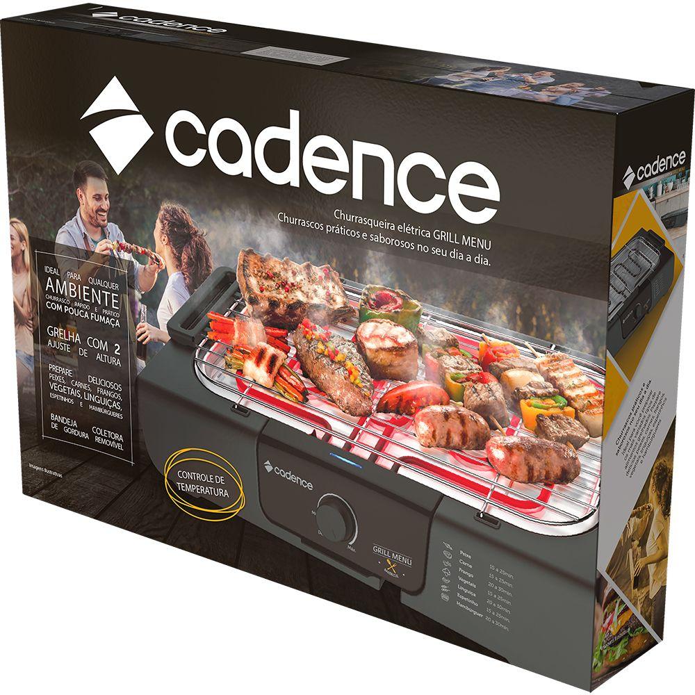 Churrasqueira Elétrica Cadence Grill Menu - 220v 220vVocê pode fazer churrascos, petiscos, espetinhos, hambúrgueres ou grelhados com mais facilidade! É indicada para quem tem pouco espaço em casa ou no apartamento, e pode ainda ser levada para qualquer lugar que tenha energia elétrica, como acampamentos e piqueniques com a família e os amigos.Diferenciais:- Para dentro ou fora de casa, ideal para quem tem pouco espaço, em casa, no apartamento ou no acampamento.- Grelhado sem carvão, ressalta o verdadeiro sabor da carne.- Fácil de limpar: é totalmente desmontável.- 2000W de potência (220v) e 1800W (127v), o que permite assar e grelhar carnes de forma mais rápida, de acordo com a temperatura que você selecionar.- Novo design mais fácil seguro e prático de usar e limpar.Selo de Segurança OCP SGSMedidas Embalagem Indiv. [LxAxP]: 500x365x90mm | Garantia (meses): 12 meses | Modelo: GRL810-127 / GRL810-220 | Manual: https://catalog-newellbrands.s3.amazonaws.com/cadence/GRL810/manual/GRL810-manual.zip | Fotos HD: https://catalog-newellbrands.s3.amazonaws.com/cadence/GRL810/fotos-hd/GRL810-fotos-hd.zip | Midias: https://drive.google.com/file/d/1xObP-c75EA61tCXz8ECn4KcErEz2zOhu/view | Consumo: 1,8kWh - 2,0KW/H | Código de barras: 7898615984036 | 7898615984043 | Descrição do Produto: -Novo design que proporciona maior facilidade, praticidade e segurança no uso e na limpeza. - Termostato contínuo, com temperatura mín. de 50°C a 100°C e máxima entre 210°C e 250°C. - Grelha de 41x24cm, com ajuste de altura e bandeja coletora | Classificação Fiscal / NCM: 8516.60.00 | Medidas Embalagem Master [LxAxP]: 515x385x390mm | Código de Barra [DUN-14]: 1 7898615984033 / 1 7898615984040 | Peso: 1,7 kg | Qtde. por embalagem Master: 4 | Código da Certificação: SGS | Certificações: Inmetro | CEST: 21.047.00 | HTML: